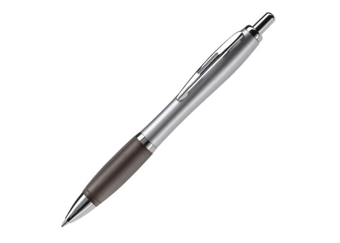 Zilveren balpen met metalen clip, gekleurde grip en een 'metal-look' drukknop, ring en punt. De pen bevat een blauwschrijvende Jumbo vulling.