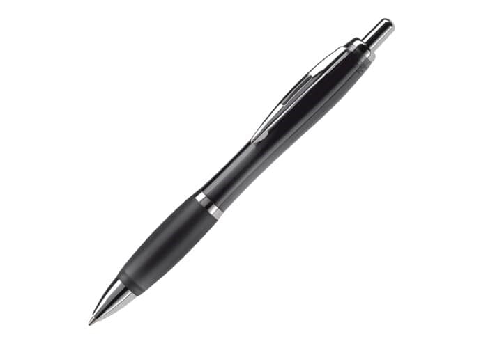 Transparante balpen met metalen clip, metal look drukknop, tussenring en penpunt. Blauwschrijvende Jumbo vulling. Vanaf 10.000 stuks andere schrijfkleur mogelijk.
