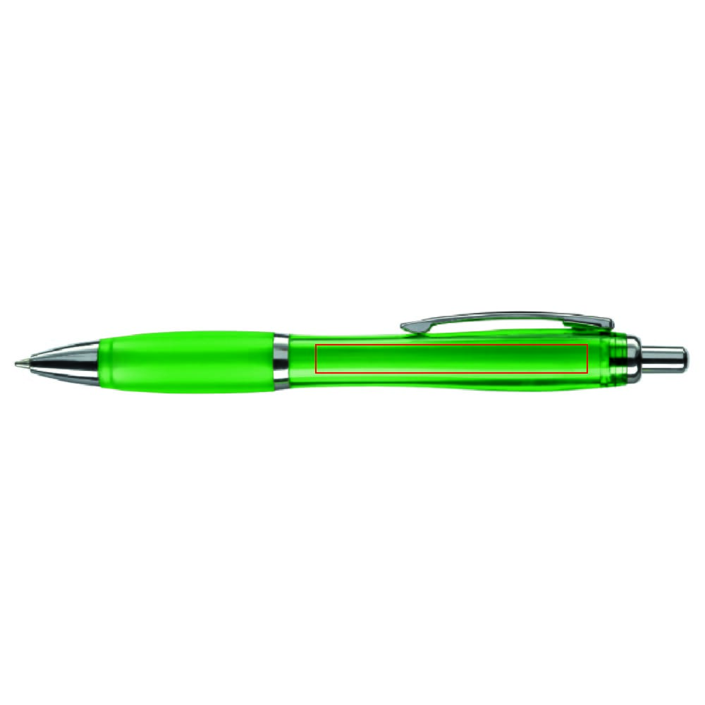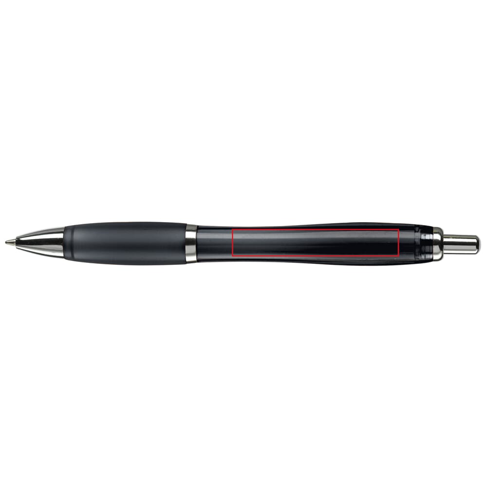 Transparante balpen met metalen clip, metal look drukknop, tussenring en penpunt. Blauwschrijvende Jumbo vulling. Vanaf 10.000 stuks andere schrijfkleur mogelijk.