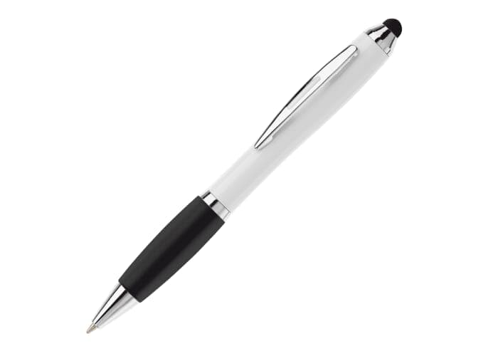 Balpen met touchscreen punt en frosty grip, draaimechanisme en metalen punt, metal look ring en clip. Blauwschrijvende X20 vulling.