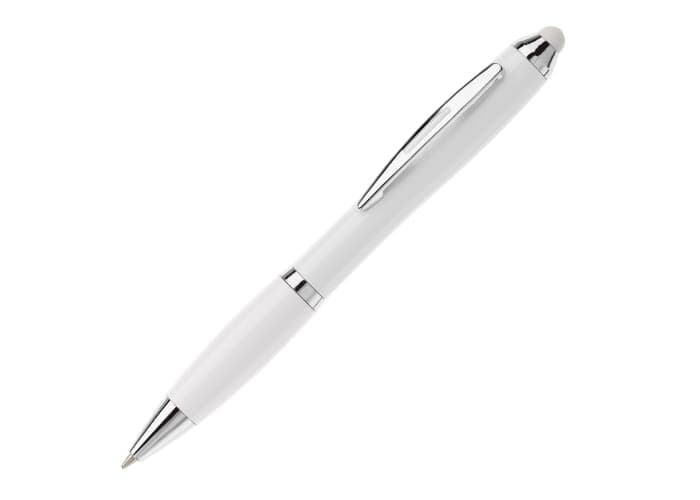 Balpen met touchscreen punt en frosty grip, draaimechanisme en metalen punt, metal look ring en clip. Blauwschrijvende X20 vulling.