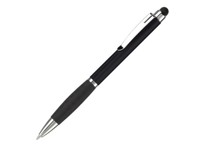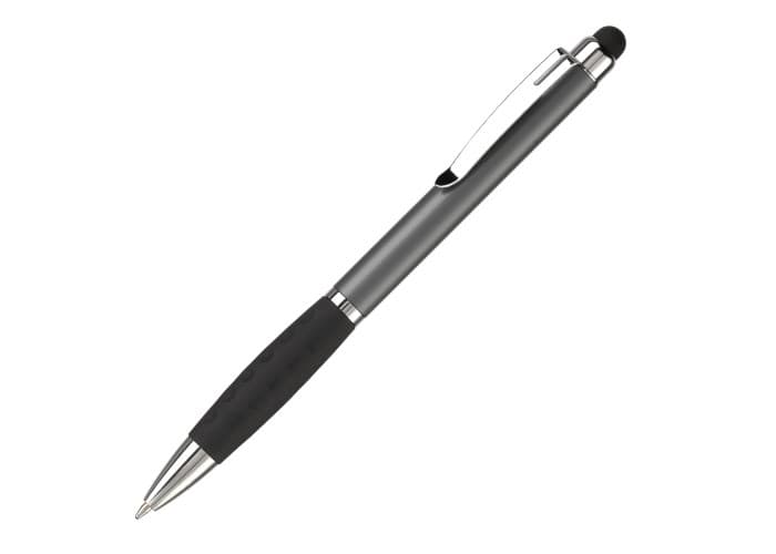 Kunststof balpen met zachte grip en bijpassende touch tip. Draaimechanisme en blauwe inkt.