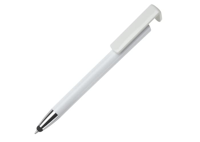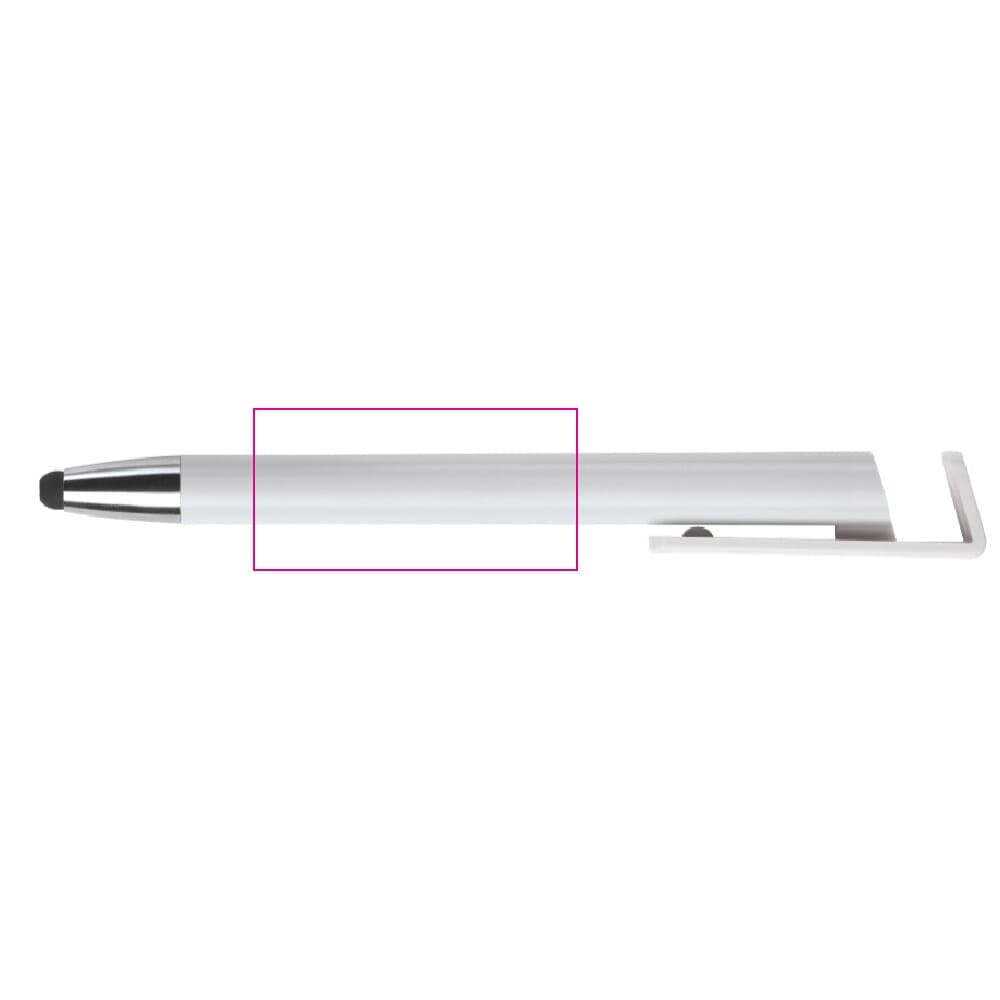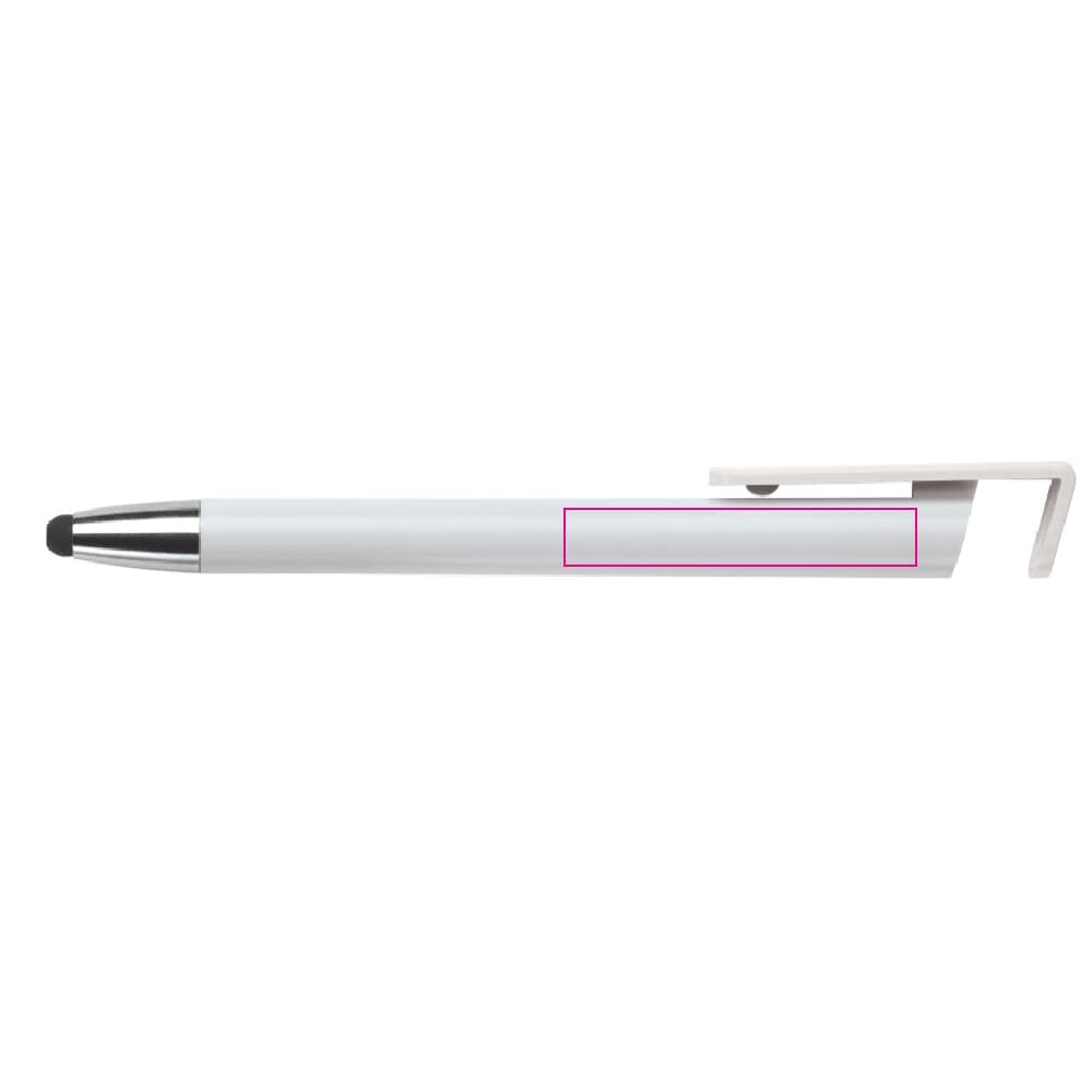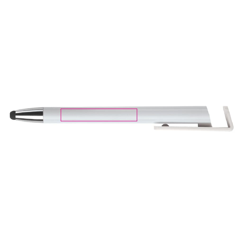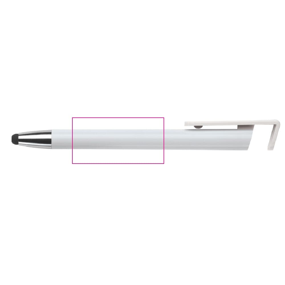 Moderne 3-in-1 balpen met stylus en telefoonstandaard. Een zeer hippe weggever in een strak design. Blauwschrijvende vulling en ideaal voor pennen bedrukken.