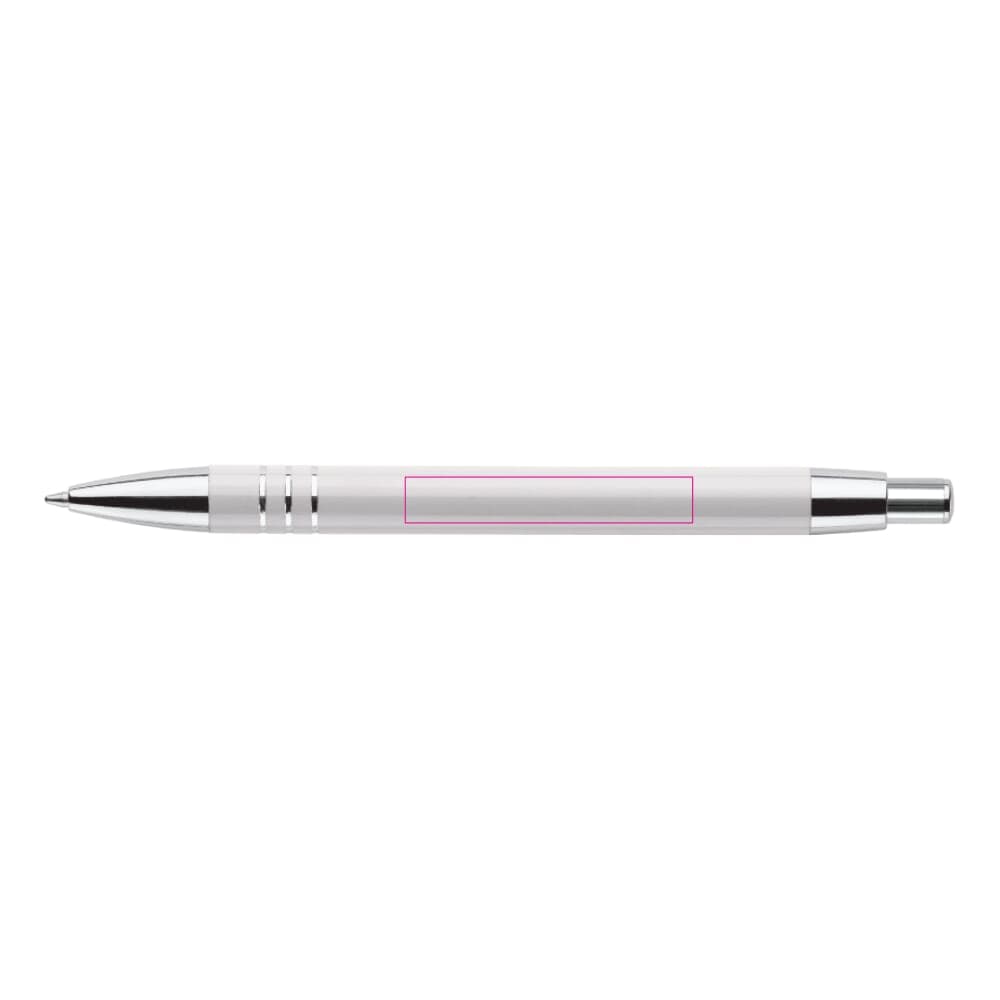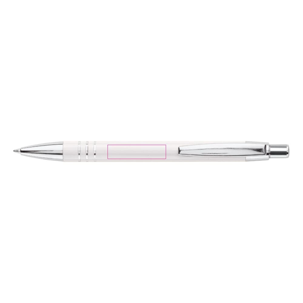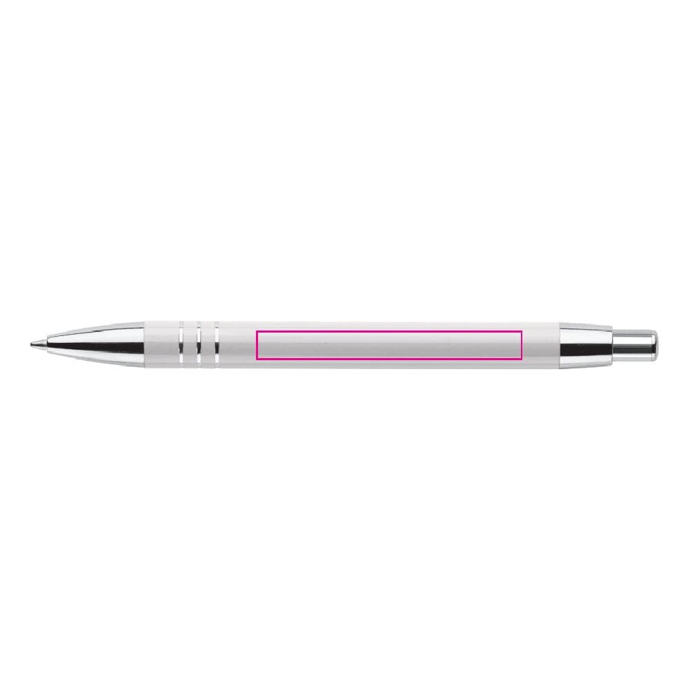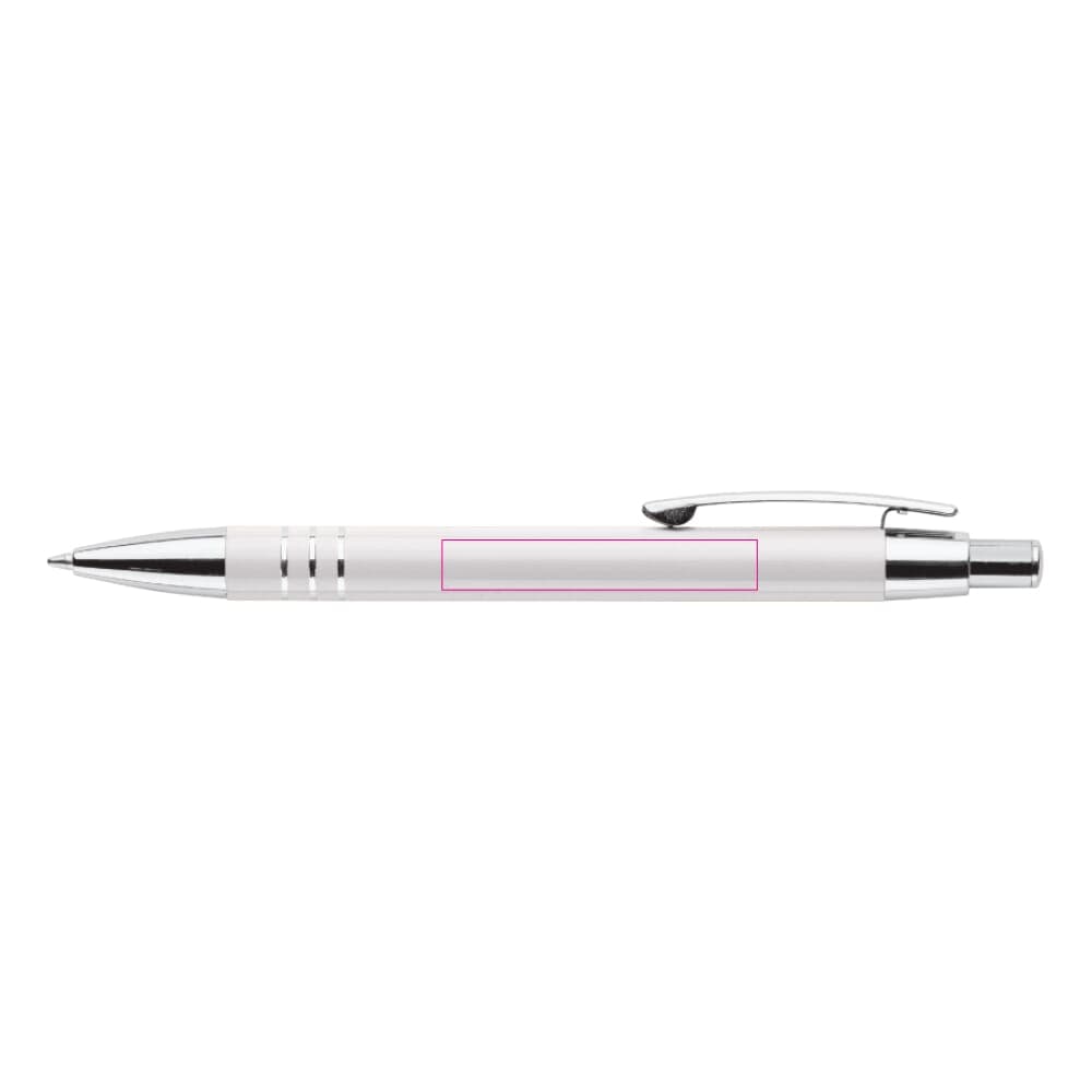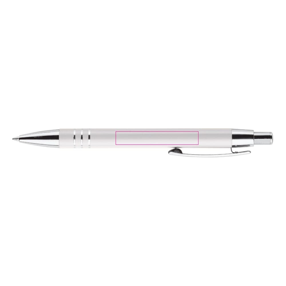 Aluminium balpen met drie verchroomde ringen. De balpen zit verpakt in een aluminium koker. Wordt geleverd met blauwschrijvende vulling.