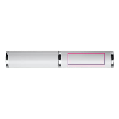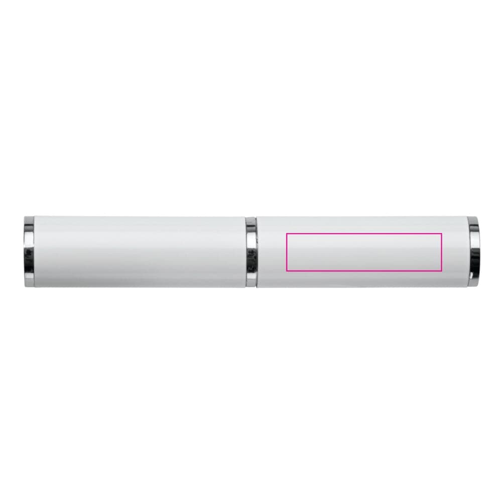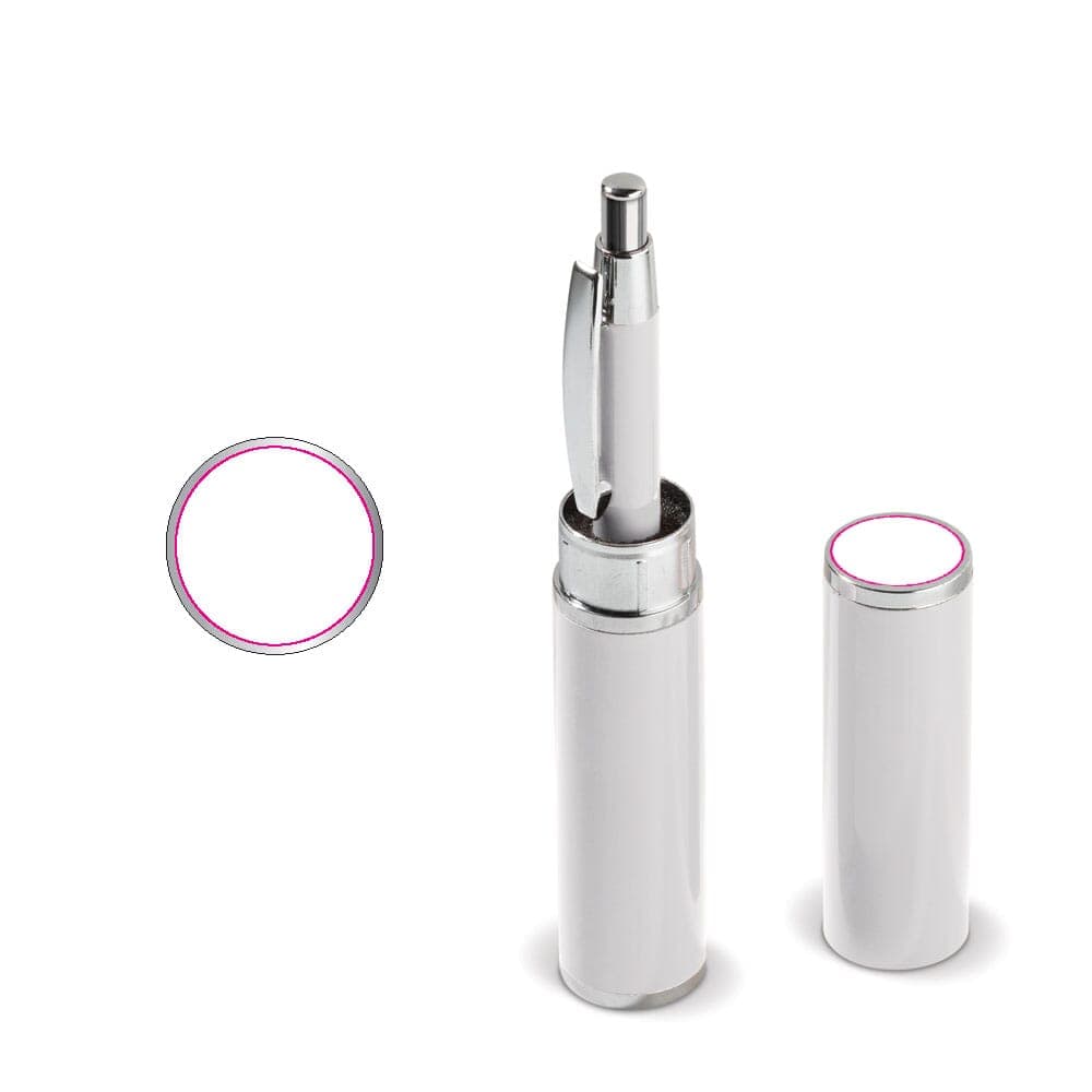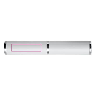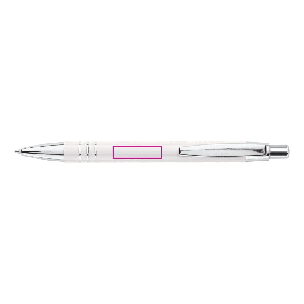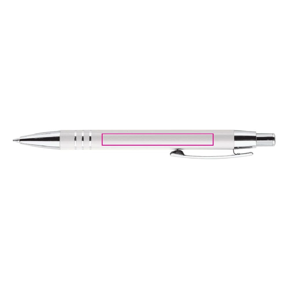 Aluminium balpen met drie verchroomde ringen. De balpen zit verpakt in een aluminium koker. Wordt geleverd met blauwschrijvende vulling.