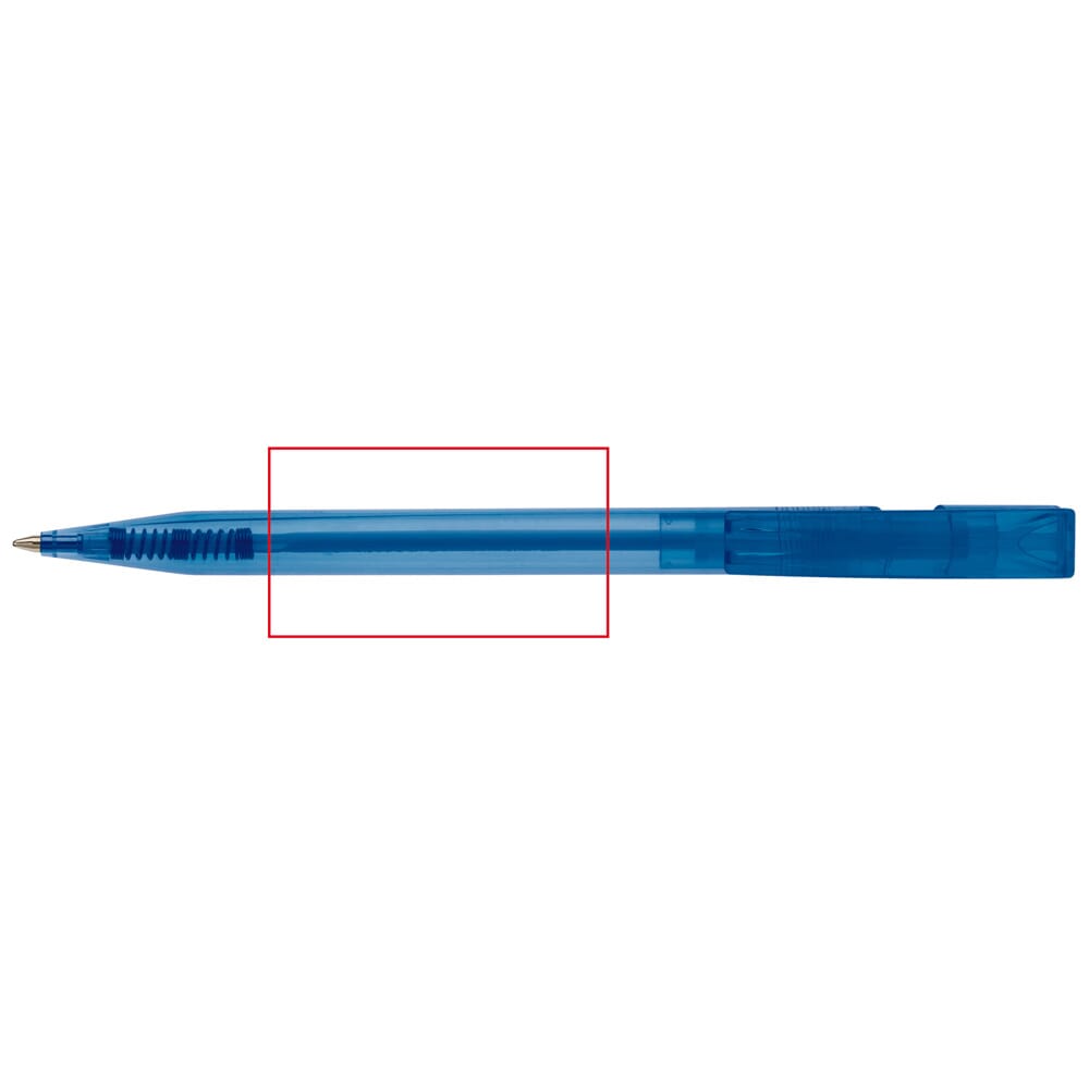 Toppoint design balpen, geproduceerd in Duitsland. Deze pen bevat een X20 vulling voor 2,5km schrijfplezier. Transparante pen met blauwschrijvende vulling.