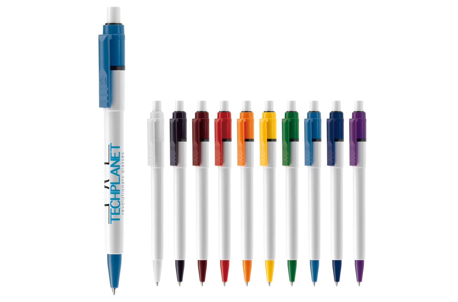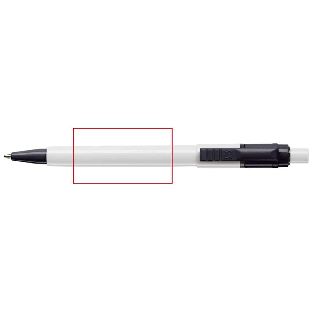 De Baron Colour balpen met een witte barrel en drukker en met een gekleurde clip en tip. De vulling is een synthetische Jumbo vulling en bevat blauw schrijvende inkt. Het bevat een drukker mechanisme en is gemaakt van ABS kunststof. De pen is geproduceerd in Europa. Kleur combinaties voor deze kunststoffen pen zijn mogelijk vanaf 5.000 stuks.