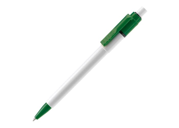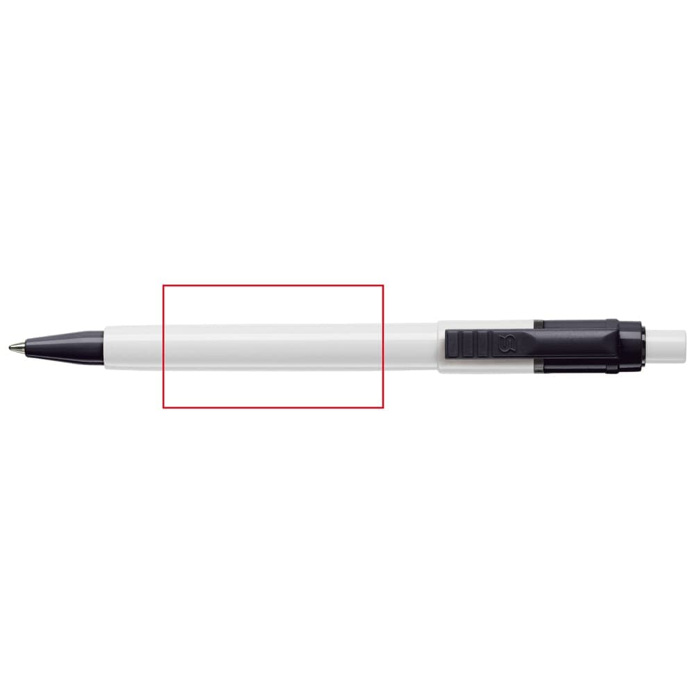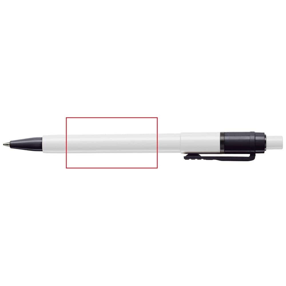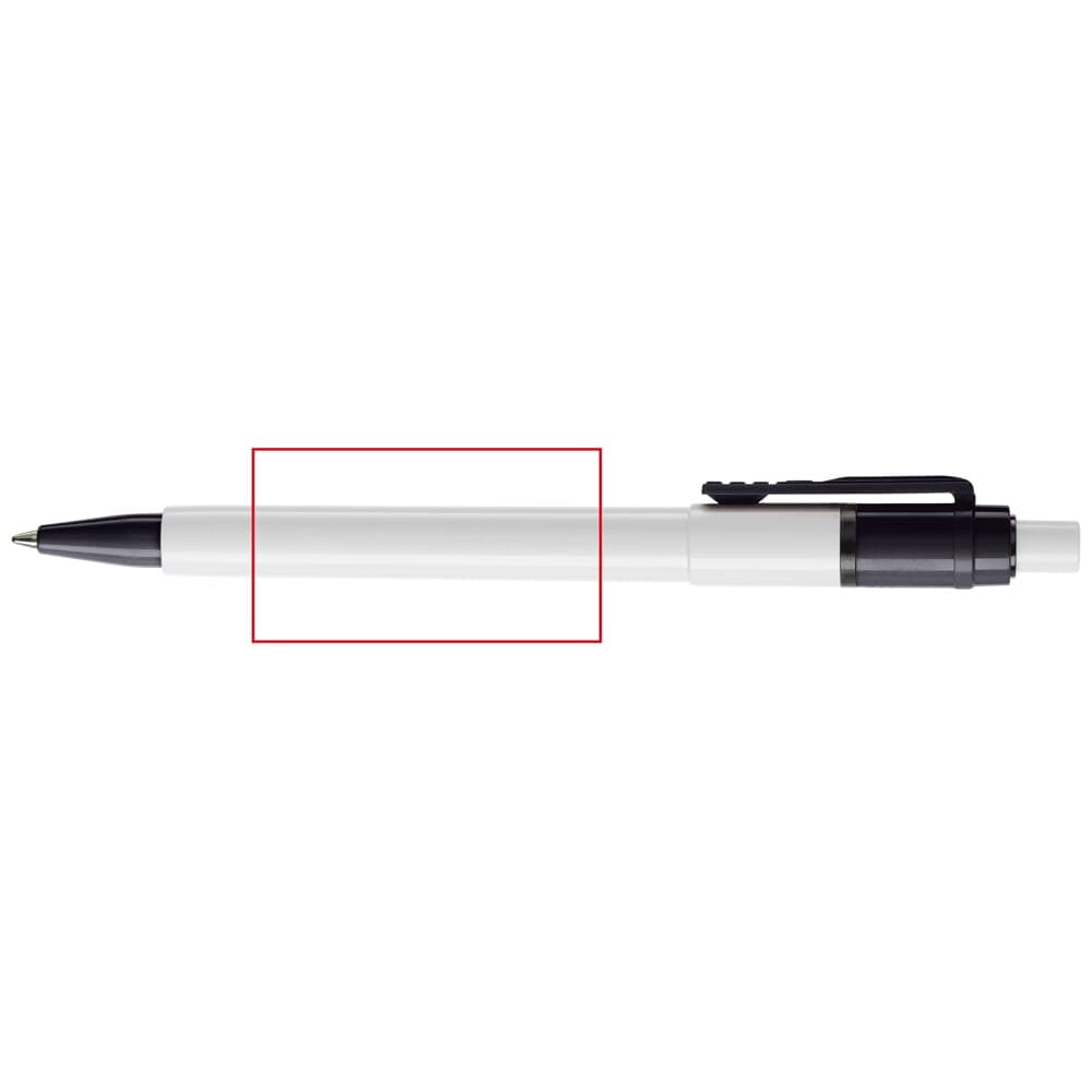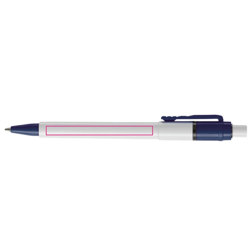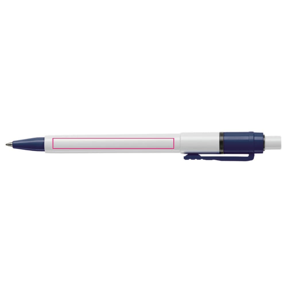 De Baron Colour balpen met een witte barrel en drukker en met een gekleurde clip en tip. De vulling is een synthetische Jumbo vulling en bevat blauw schrijvende inkt. Het bevat een drukker mechanisme en is gemaakt van ABS kunststof. De pen is geproduceerd in Europa. Kleur combinaties voor deze kunststoffen pen zijn mogelijk vanaf 5.000 stuks.