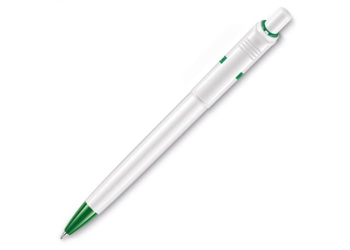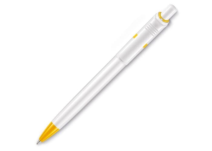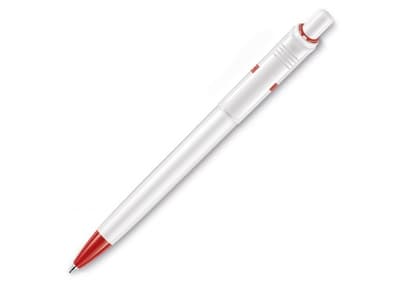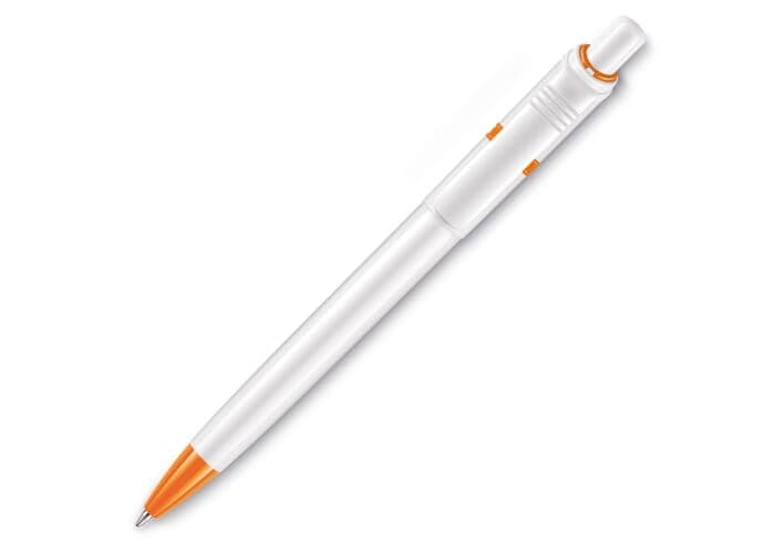 De Baron Colour balpen met een witte barrel en drukker en met een gekleurde clip en tip. De vulling