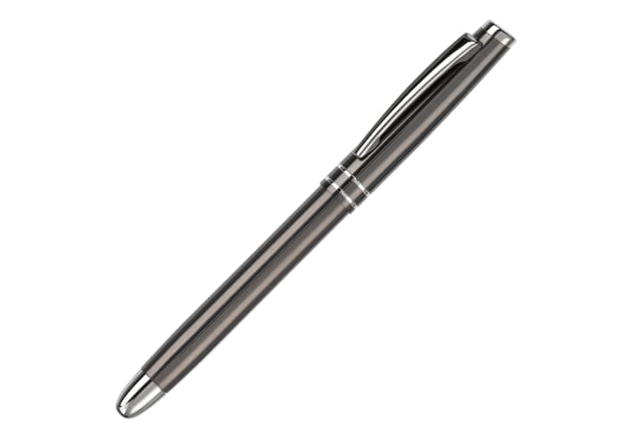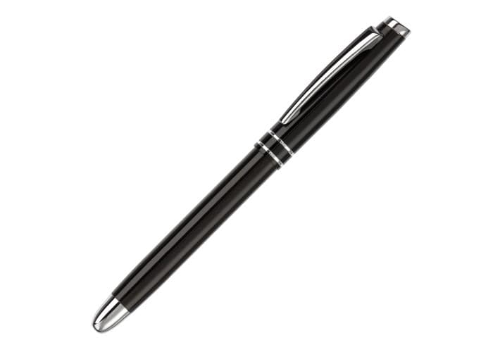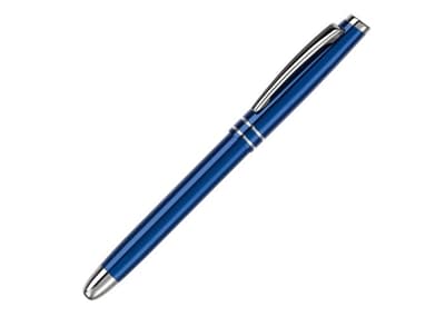 Blauwschrijvende aluminium rollerball pen met dop en twee strepen. Lasergravure mogelijk.