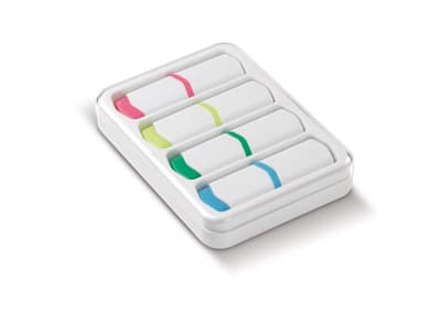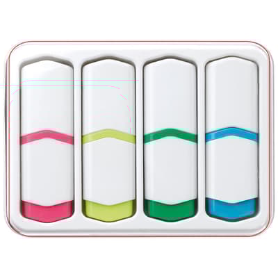 Set van vier Toppoint design mini tekstmarkers in handige kunststof verpakking met transparante deksel. De tekstmarkers hebben een uniek design en de gekleurde details geven de schrijfkleur aan.