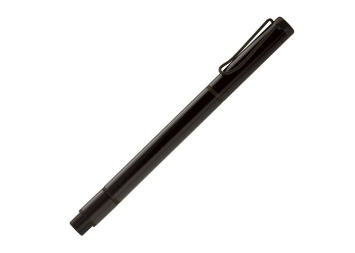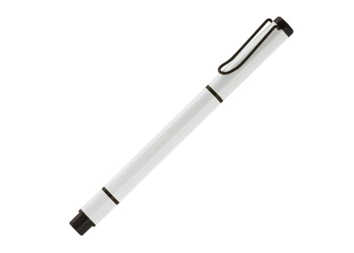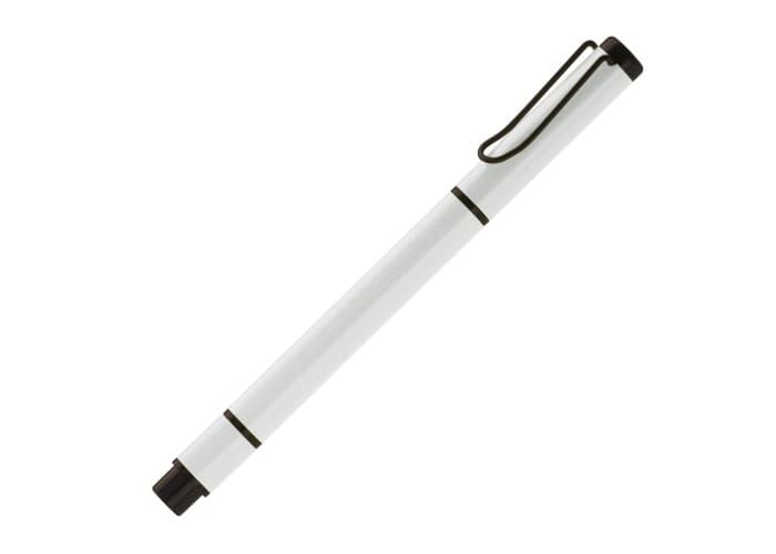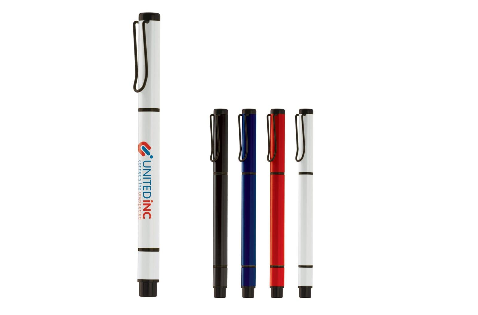 Stijlvolle metalen balpen met schuifkap (blauwschrijvend) en (gele) tekstmarker. Vanaf 5.500 stuks andere schrijfkleuren mogelijk.