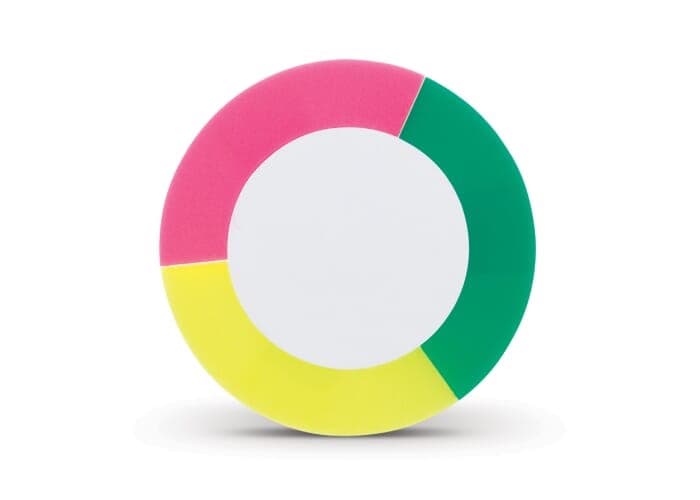 Toppoint design ronde tekstmarker met drie schrijfkleuren. Groot drukoppervlak op het witte gedeelte. Bedrukking ook mogelijk via digitale print of met een doming.