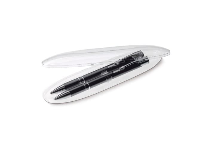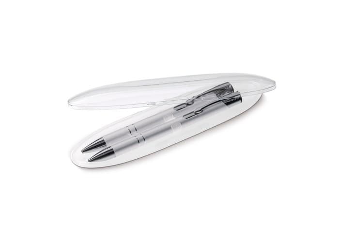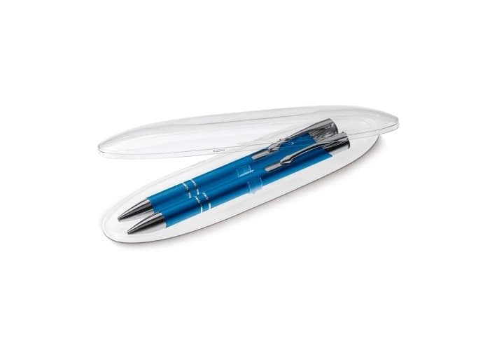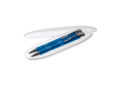 Schrijfset met Alicante balpen (LT87915) en vulpotlood (LT89216) in ovaal transparante geschenkverpakking. Bedrukking op het doosje mogelijk. Met blauwschrijvende vulling.