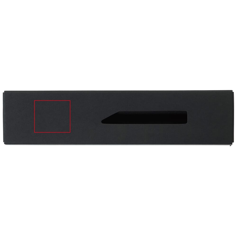 Rechthoekige zwarte kartonnen geschenkverpakking voor één balpen. Met venster en schuifdeksel. Doosje kan bedrukt worden.