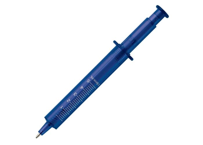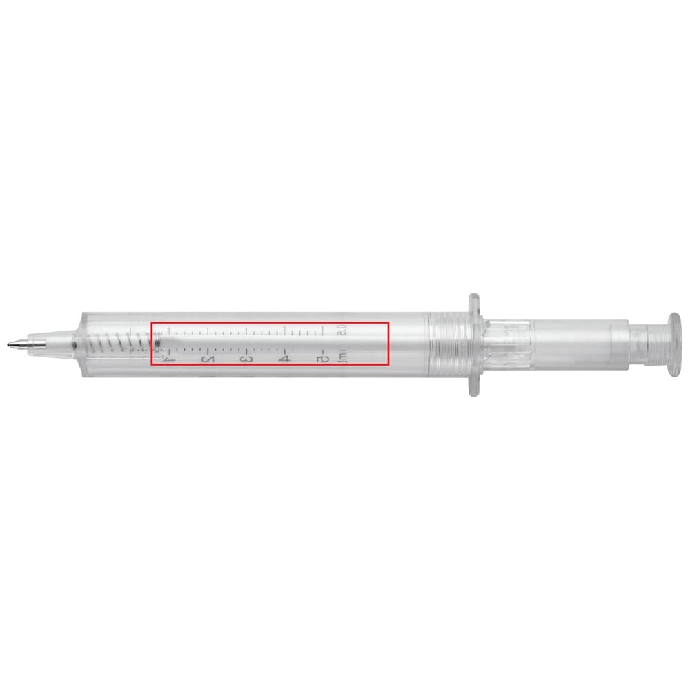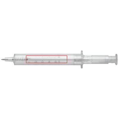 Transparante pen in de vorm van een spuit. Verkrijgbaar in verschillende kleuren.