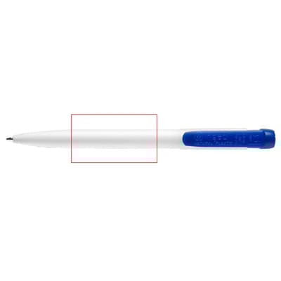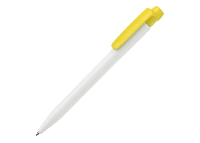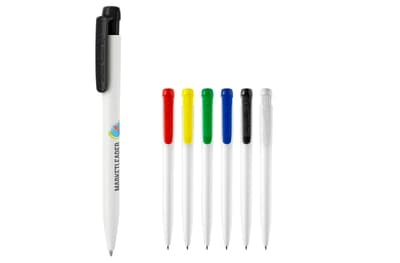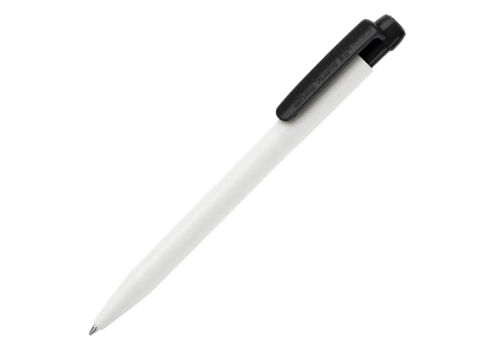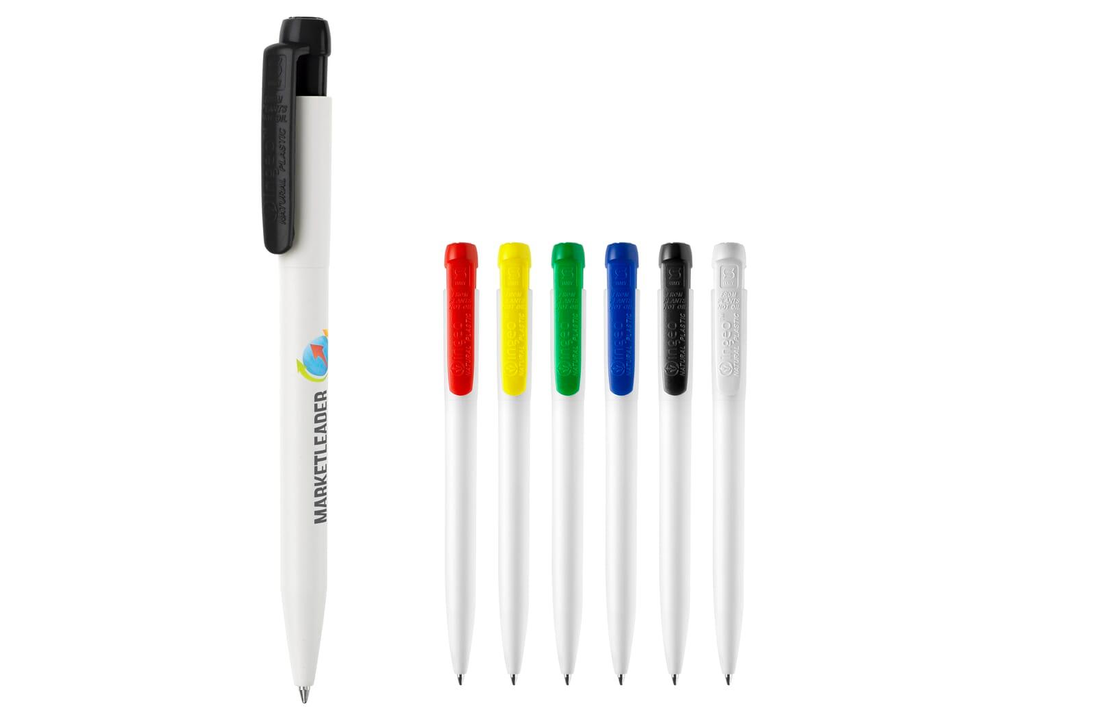 Hardcolour witte Ingeo TM balpen met gekleurde clip. Gemaakt van PLA kunststof, wat een biologisch afbreekbaar materiaal is. Dit betekend dat de pen een goede en duurzame keuze is als promotioneel artikel. De pen bevat een X20 vulling met blauw schrijvende inkt. Het heeft een drukmechaniek en is geproduceerd in Europa. Kleur combinaties voor deze pen zijn mogelijk vanaf 5.000 stuks.