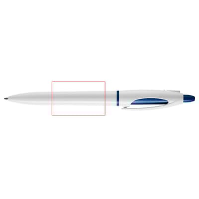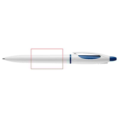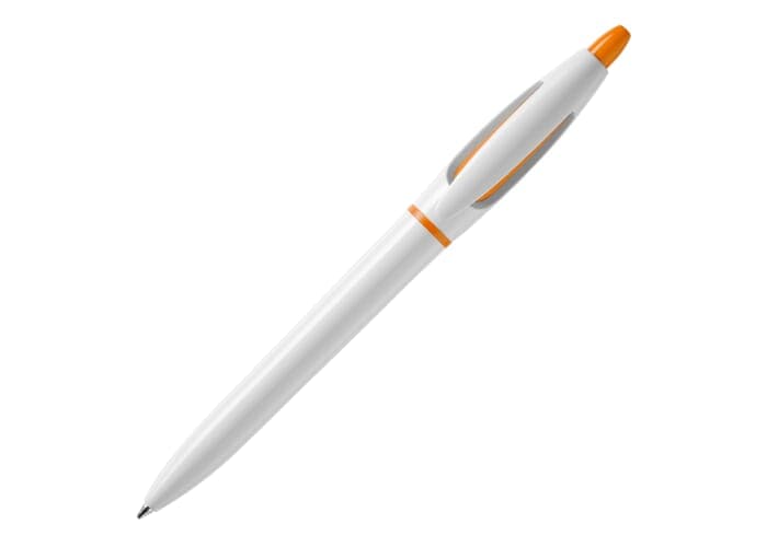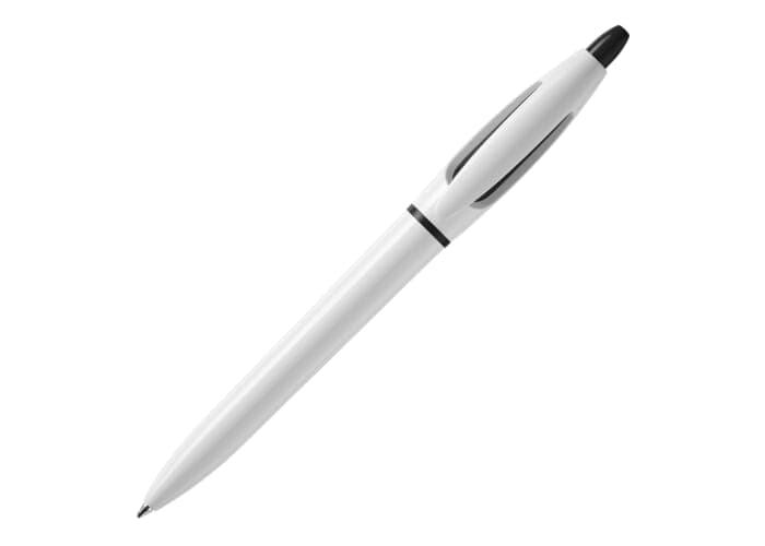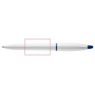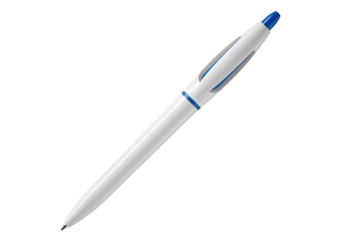 Hardcolour balpen S! met witte barrel en clip. De drukker en ring zijn gekleurd. Inclusief een X20 vulling met blauw schrijvende inkt. De pen bevat een drukmechaniek en is gemaakt van ABS kunststof. Geproduceerd in Europa. Kleur combinaties voor deze pen zijn mogelijk vanaf 5.000 stuks.