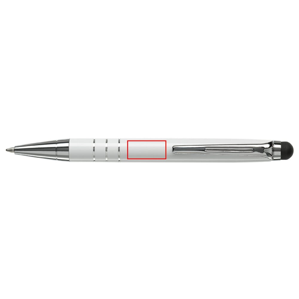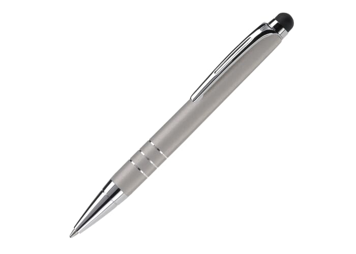 Kleine aluminium balpen met touchscreen bovenkant en draaimechanisme, ideaal voor touchscreen pennen bedrukken.