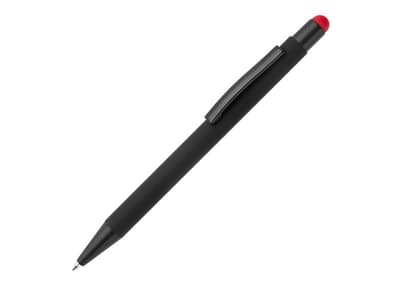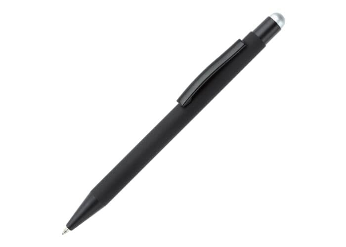Elegante metalen balpen met zwarte delen en gekleurde styluspunt. De balpen kan voorzien worden van een lasergravure en het logo zal in de kleur van de styluspunt uitkomen. Blauwschrijvende vulling.