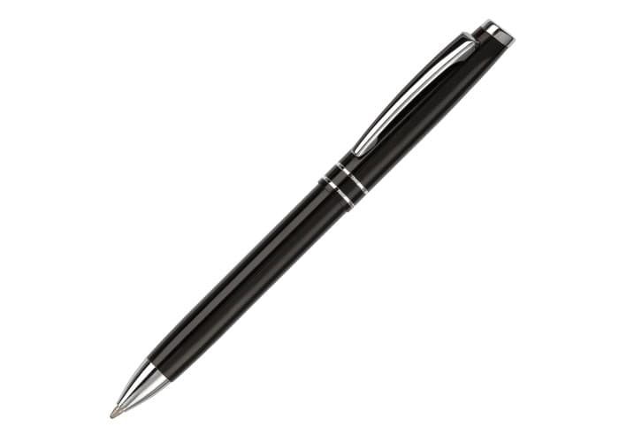Blauwschrijvende aluminium balpen met twee strepen. Lasergravure mogelijk.