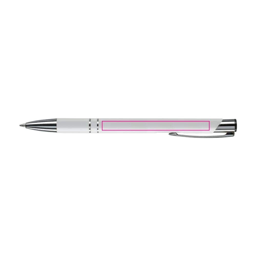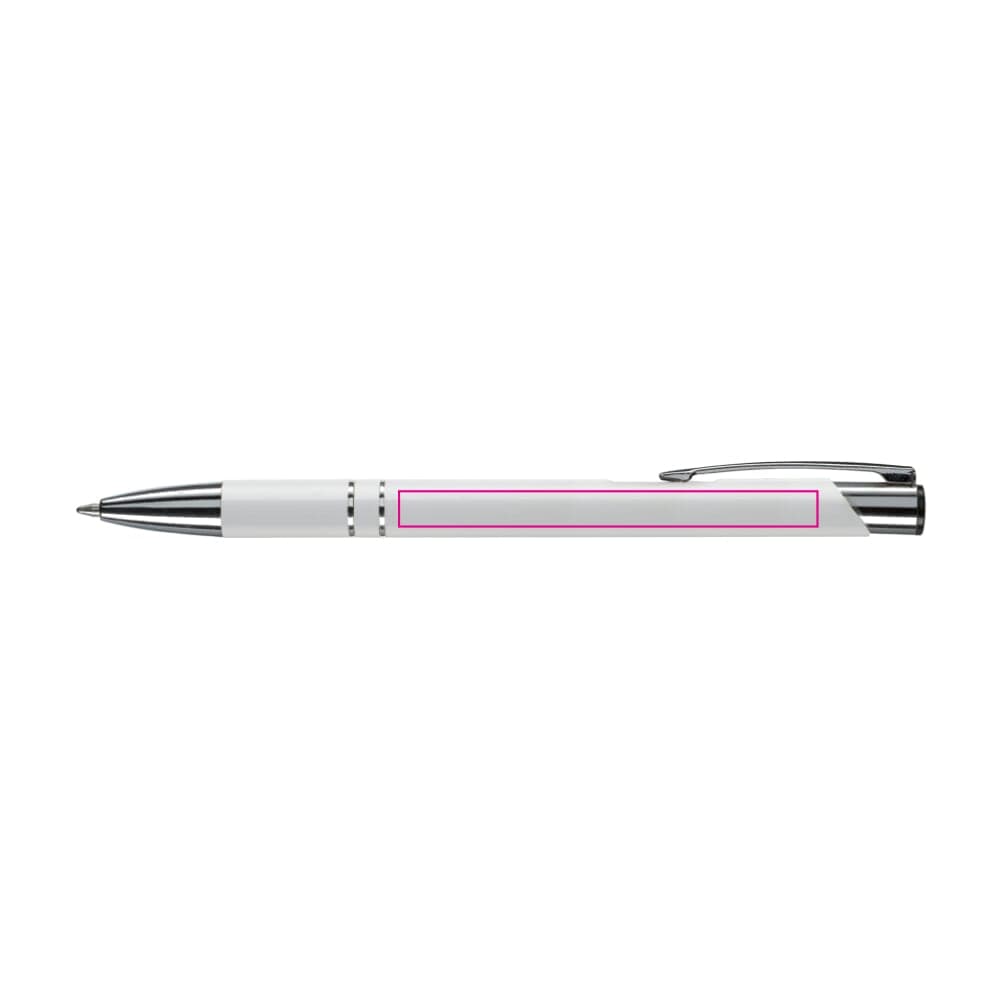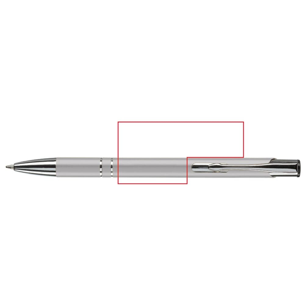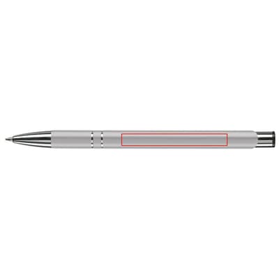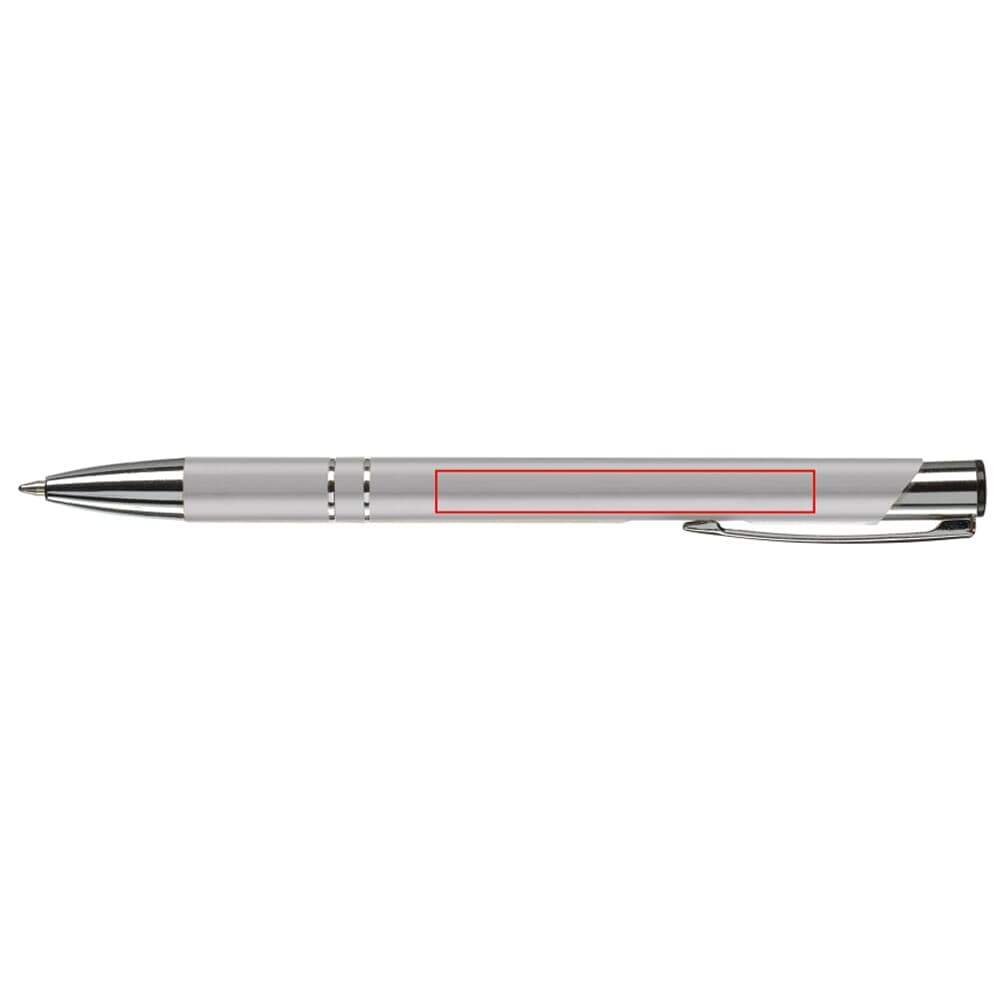 Elegante aluminium balpen. Met twee ringen in het lichaam van de pen als opmerkelijk detail. Blauwschrijvende plastic vulling.