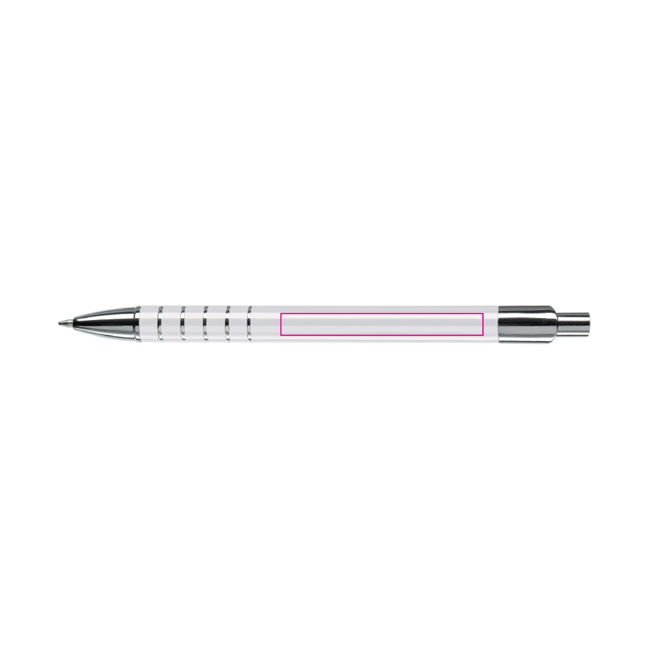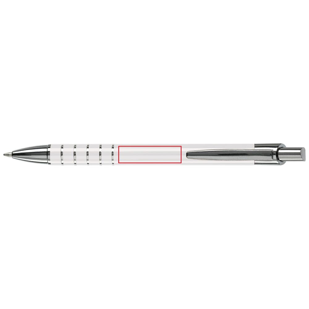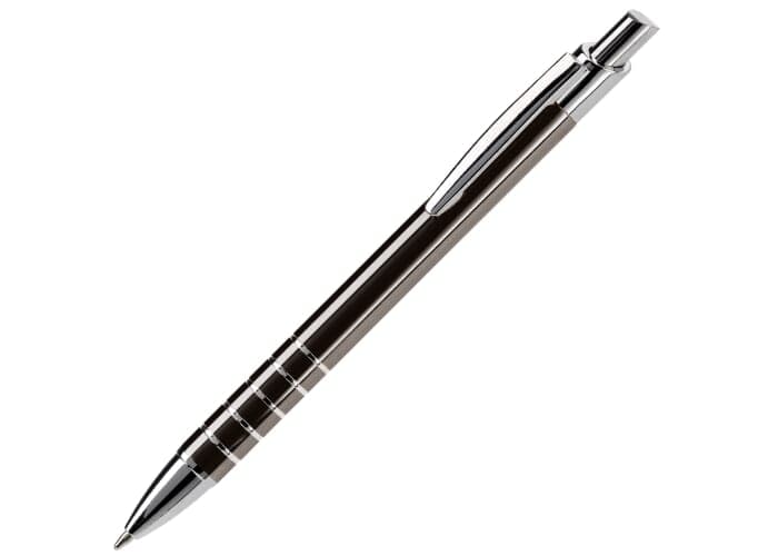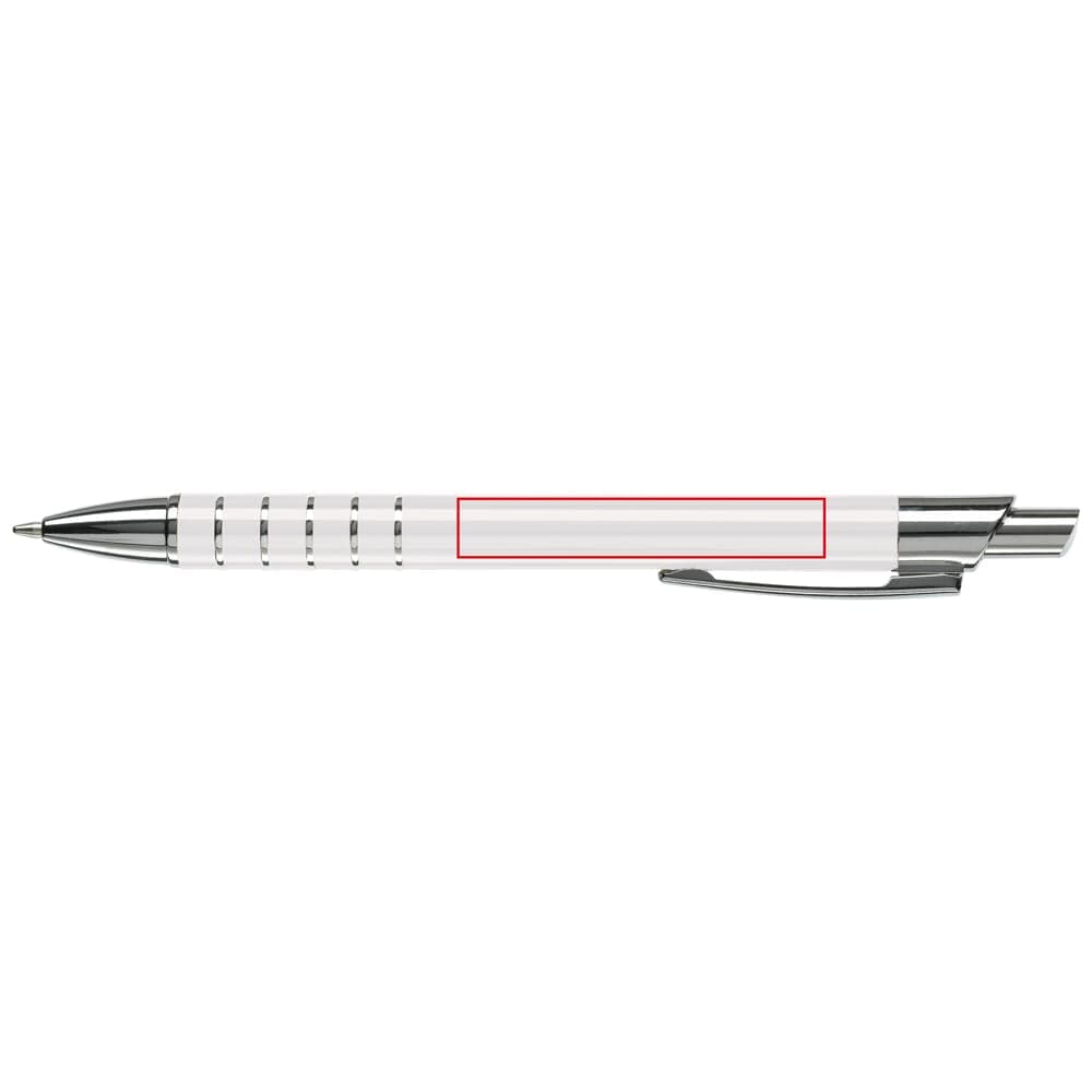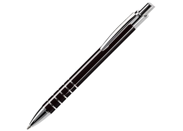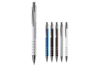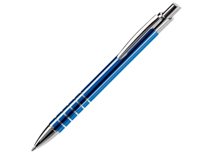 Aluminium balpen in diverse kleuren met vijf ringen met zilveren afwerking. Vanaf 50 stuks enkelnaamsgravering mogelijk. Zwartschrijvende kunststof vulling.