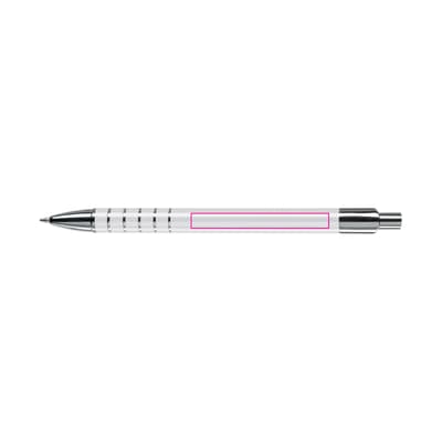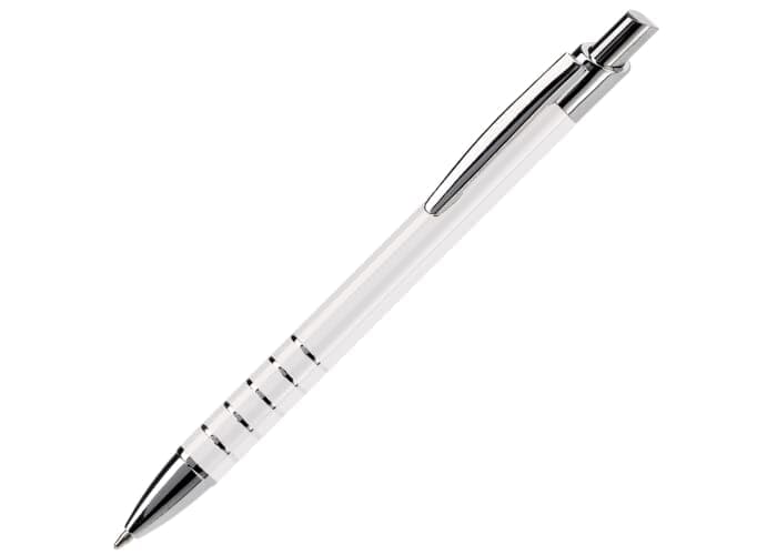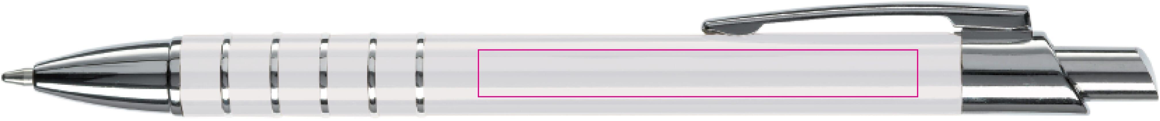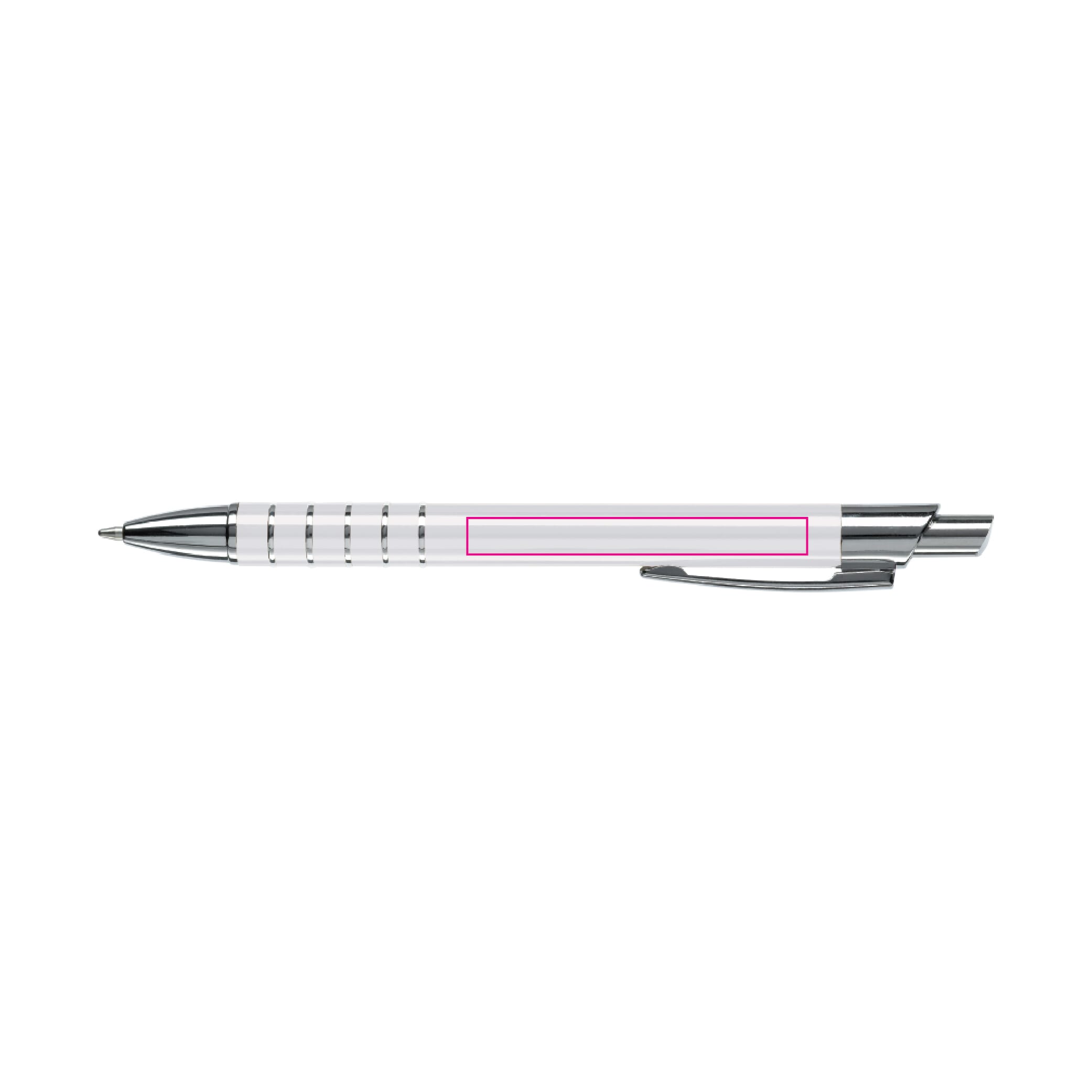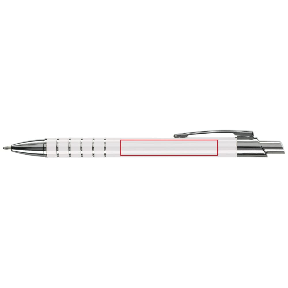 Aluminium balpen in diverse kleuren met vijf ringen met zilveren afwerking. Vanaf 50 stuks enkelnaamsgravering mogelijk. Zwartschrijvende kunststof vulling.