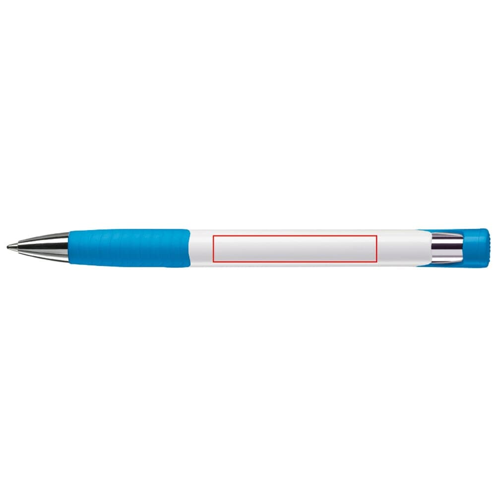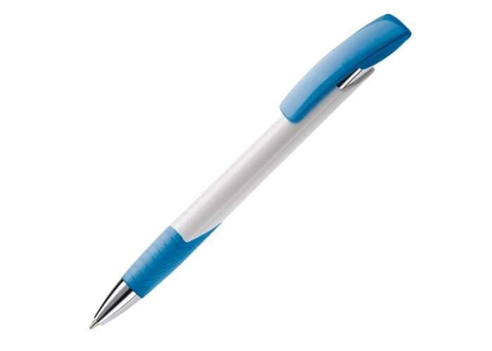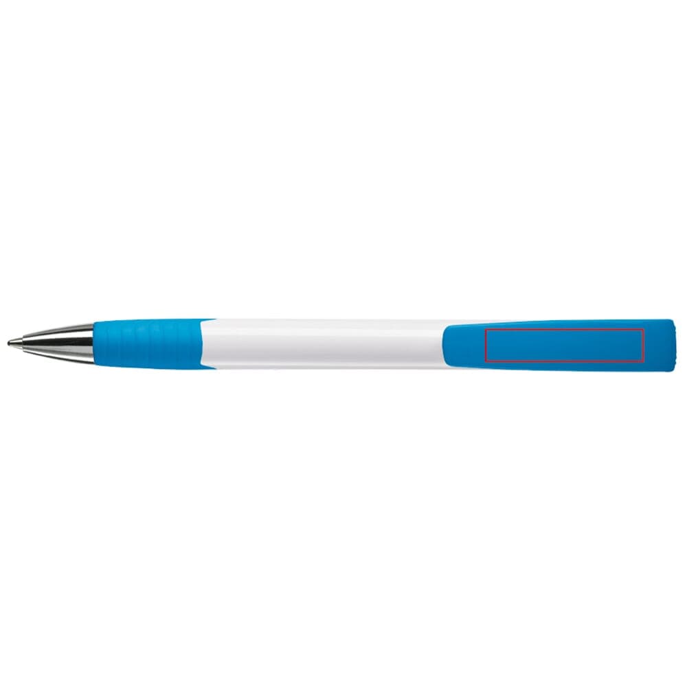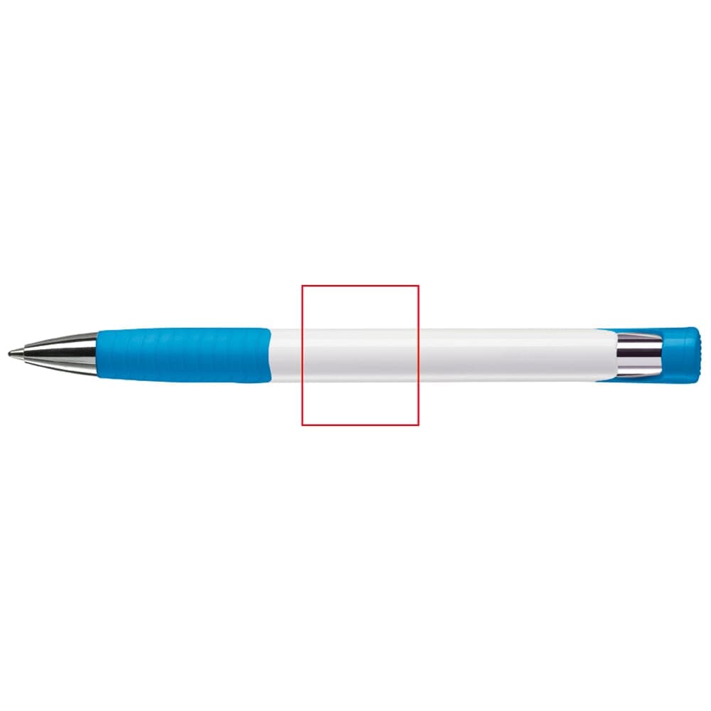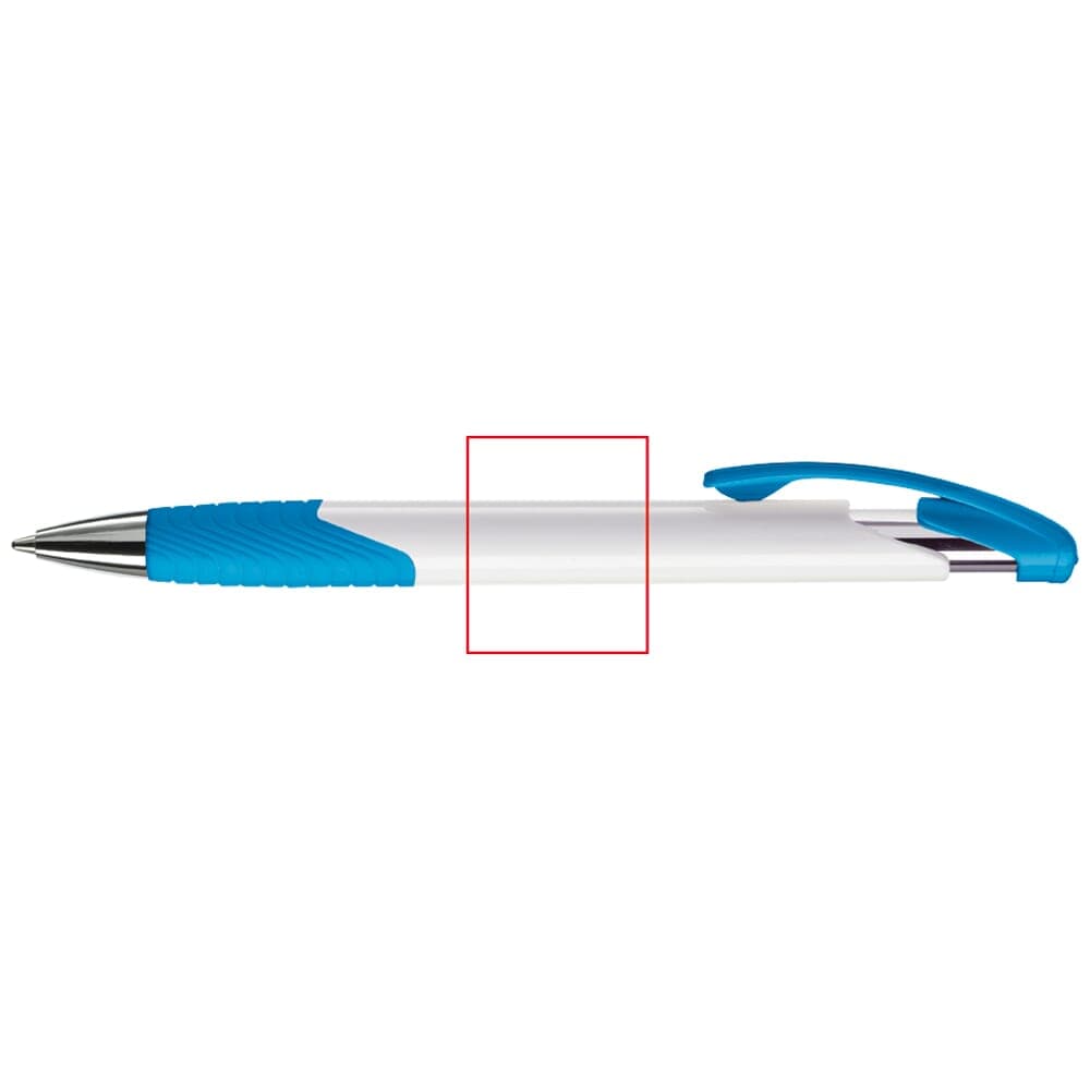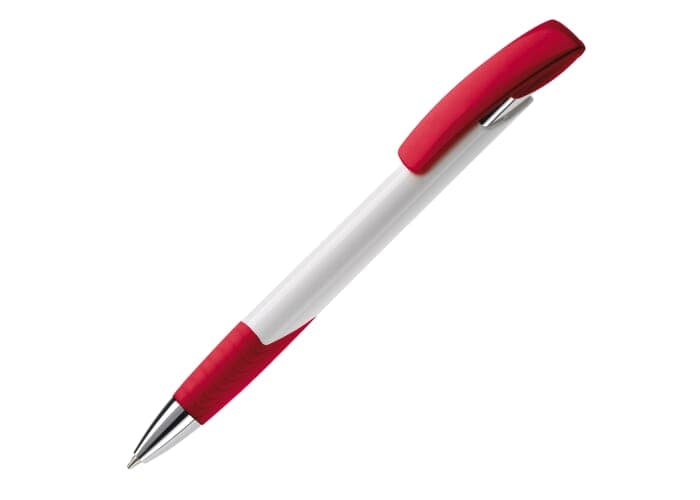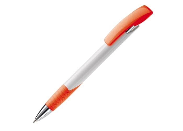 Moderne Toppoint balpen. Unieke vormgeving met hardcolour houder en metalen delen. De grip en clip zijn gekleurd.