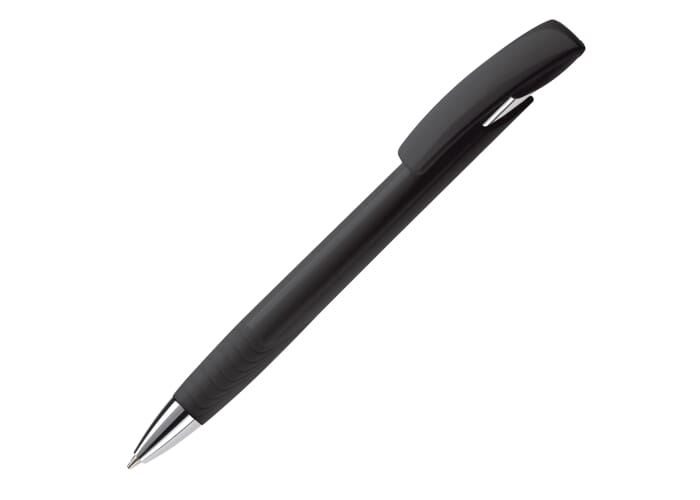 Moderne Toppoint balpen. Unieke vormgeving met hardcolour houder en zwarte grip. Met een mat metalen