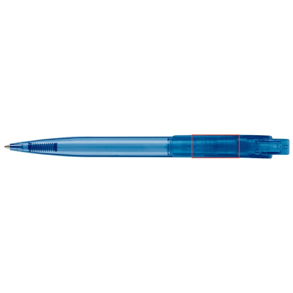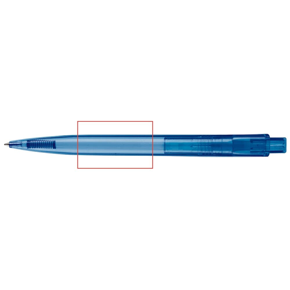 Transparante balpen met metalen clip, metal look drukknop, tussenring en penpunt. Blauwschrijvende J