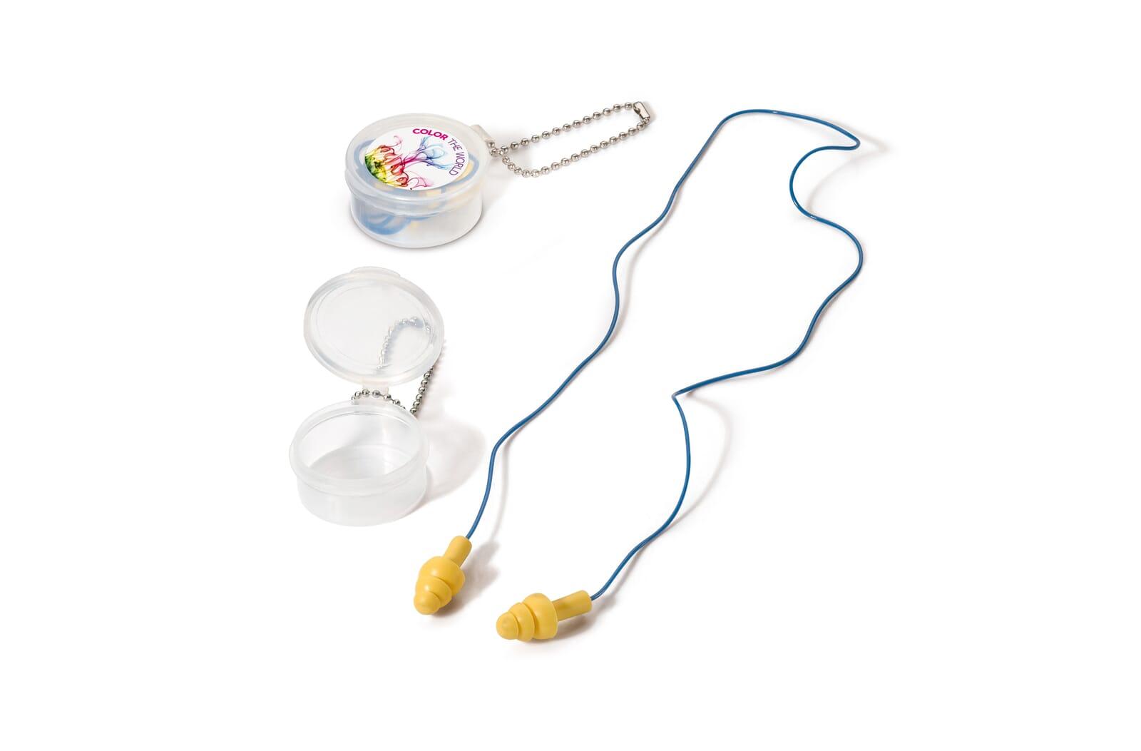 Oordopjes met koord. Om je oren te beschermen of geluid te blokkeren wanneer je in een vliegtuig zit, op het werk bent of tijdens buitenactiviteiten en evenementen. Met het handige koord kunnen de oordopjes gemakkelijk om je nek hangen wanneer ze niet worden gebruikt. Volledige kleurenopdruk mogelijk op de doos. Voldoet aan EN 352-normen. Geluidsreductie van 20-25 dB. Perfect voor oordopjes bedrukken.