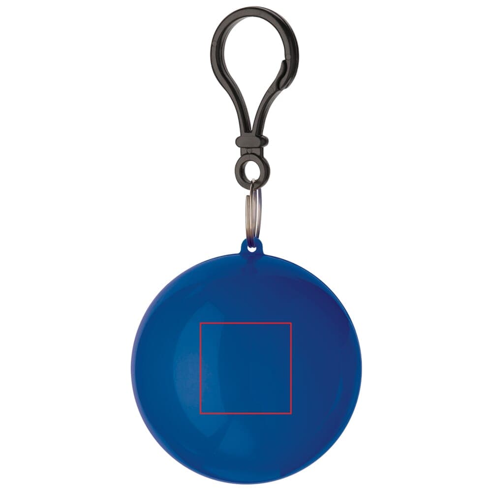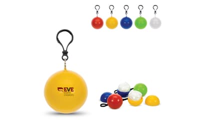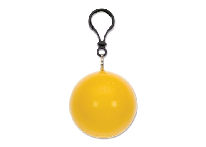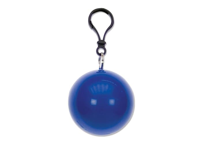 Regenponcho verpakt in bal. Altijd handig voor onderweg als het plotseling gaat regenen. Met karabijnhaak voor bevestiging aan bijvoorbeeld fiets of tas.