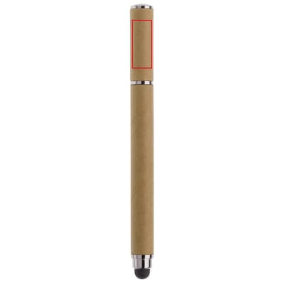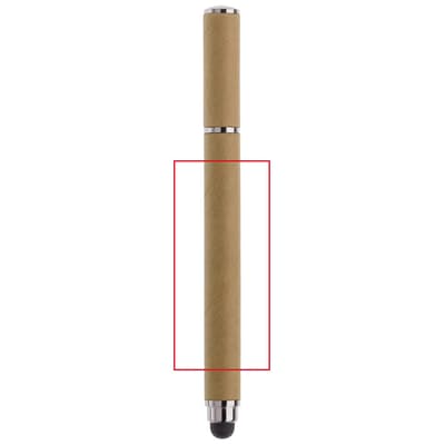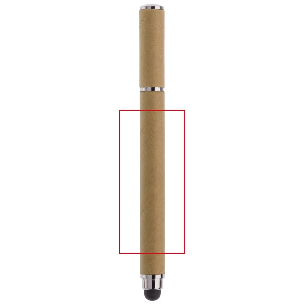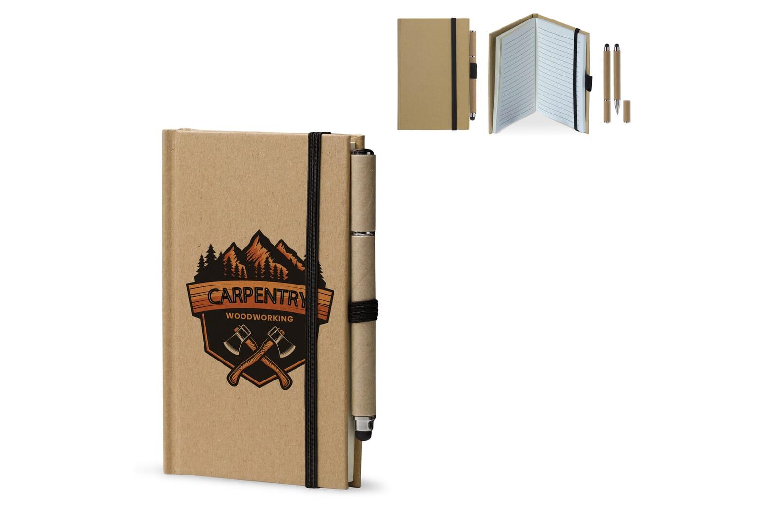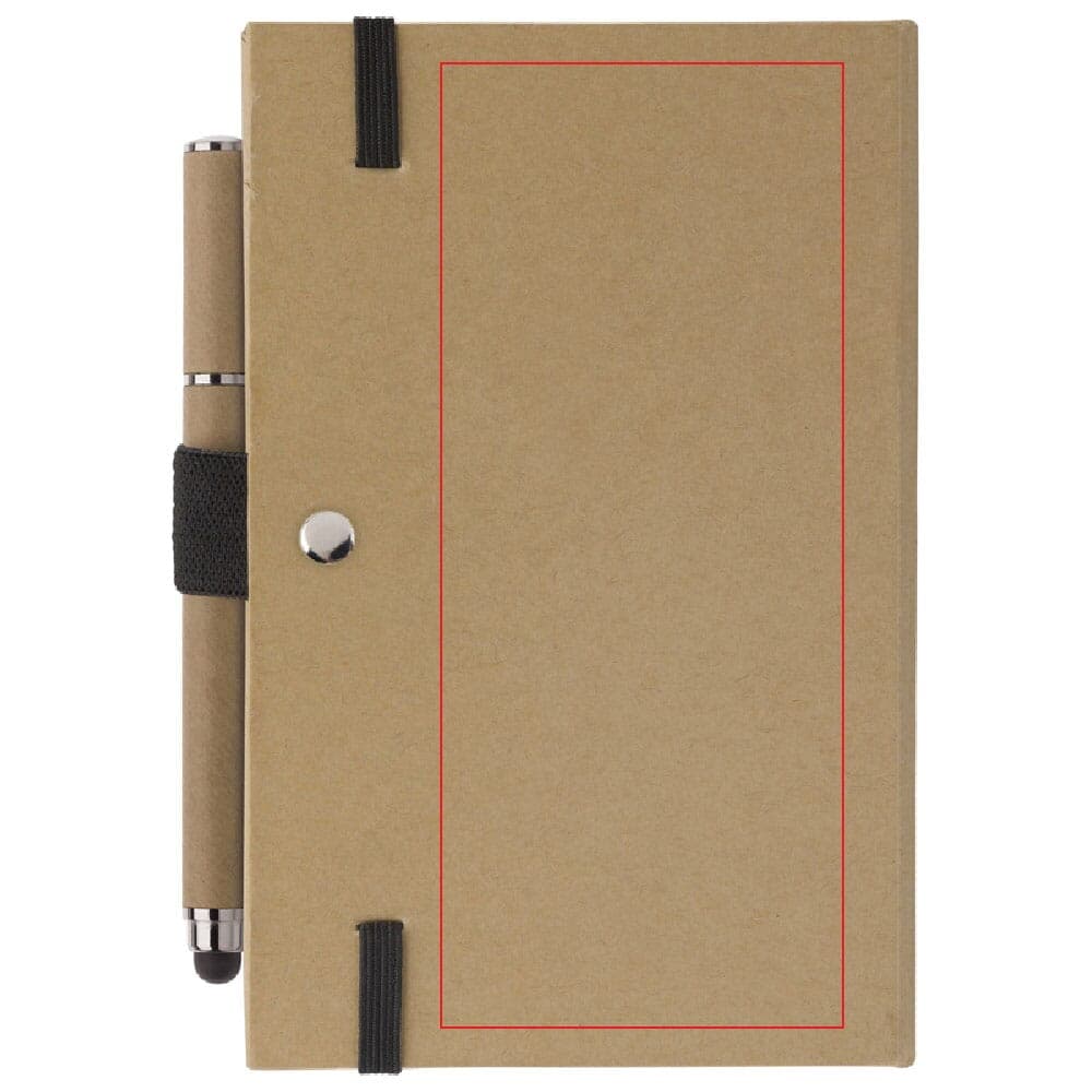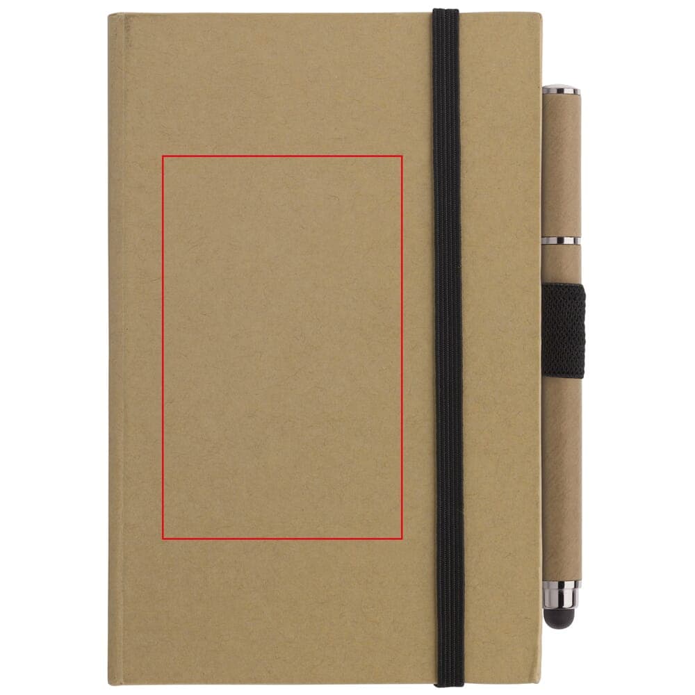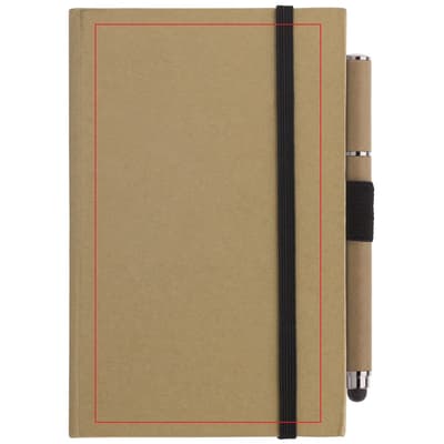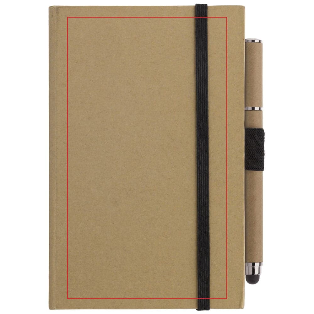 Notitieboek met kartonnen omslag in A6 formaat met elastiek en 160 gelinieerde crèmekleurige pagina's. Inclusief kartonnen styluspen.