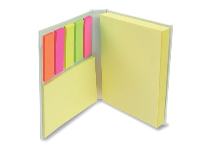 Klein notitieboekje met 100 zelfklevende grote memoblaadjes (100x75mm), 25 kleine zelfklevende memoblaadjes (50x75mm) en vijf 25 kleurige opmerkingenblaadjes. Groot drukoppervlak op de voor- en achterzijde.