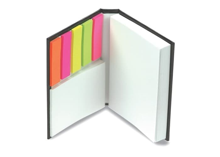 Klein notitieboekje met 100 zelfklevende grote memoblaadjes (100x75mm), 25 kleine zelfklevende memoblaadjes (50x75mm) en vijf 25 kleurige opmerkingenblaadjes. Groot drukoppervlak op de voor- en achterzijde.