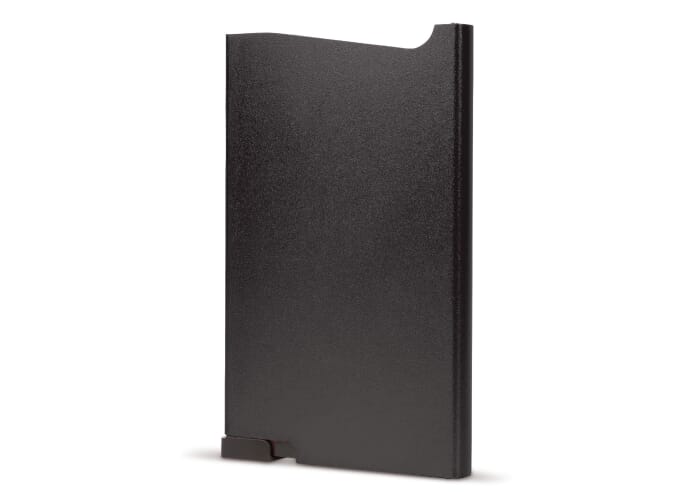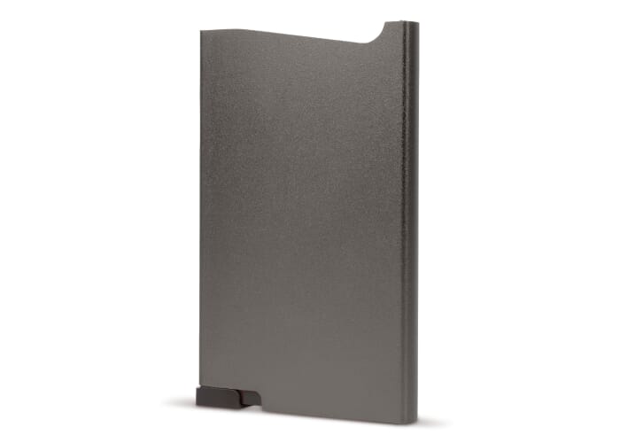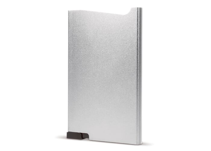 Uniek design aluminium kaarthouder om (bank)passen te beschermen tegen RFID skimming. Druk op de knop en zes kaarten (vier met verdikte letters) komen getrapt uit de houder.