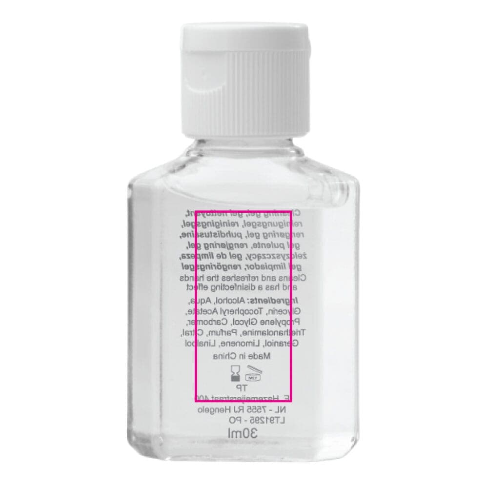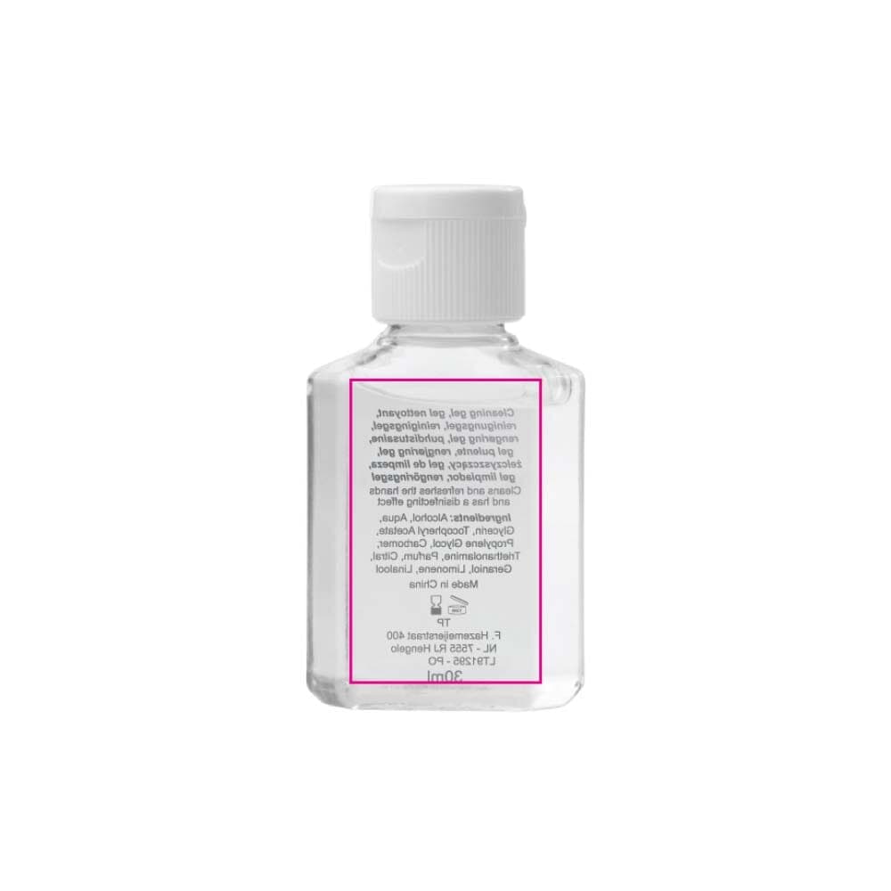 Compact flesje met reinigingsgel voor handen op basis van alcohol (62%). Het flesje past in tasjes, rugzakken, reiskoffers maar ook in de broekzak.