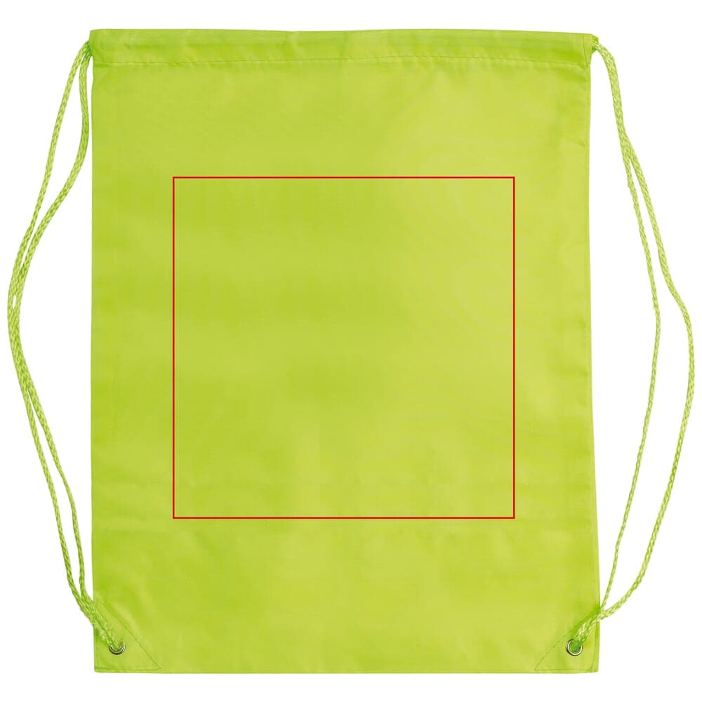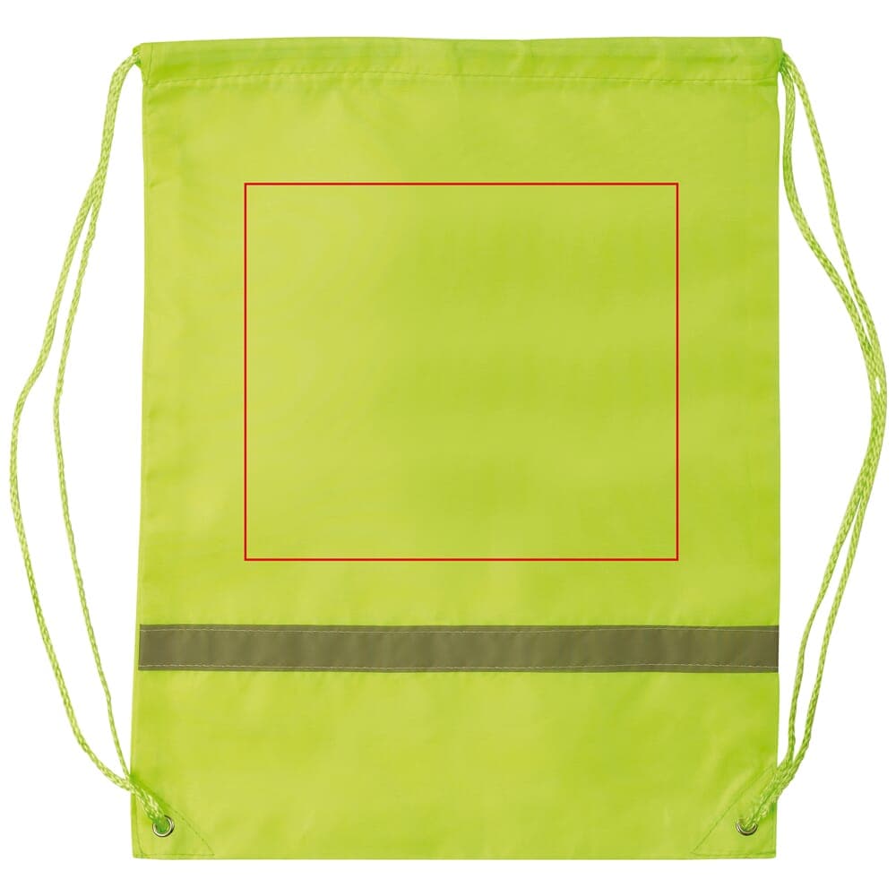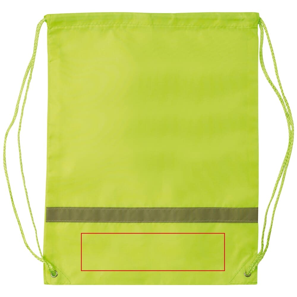 Polyester rugzak met reflecterende streep en koordsluiting. Bedrukking één kleur middels zeefdruk, meerdere kleuren in transferdruk.