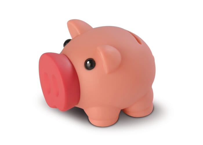 Klein spaarvarken van kunststof. Vanaf 5.500 stuks custom-made kleuren mogelijk.