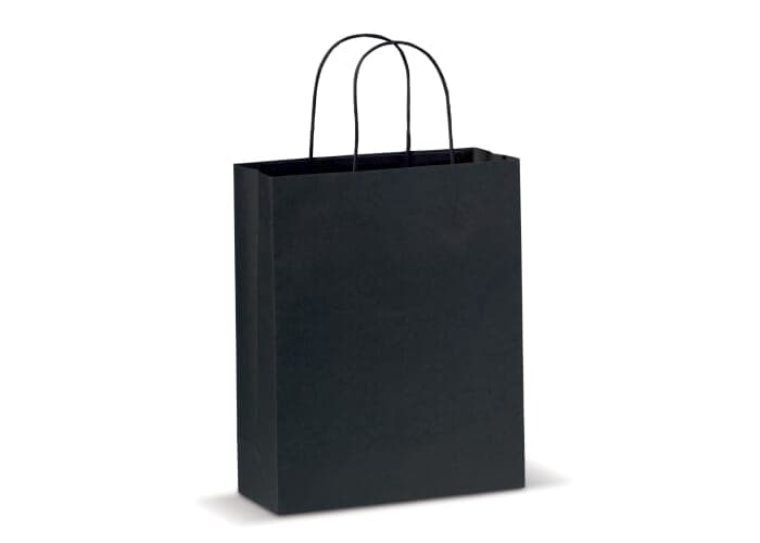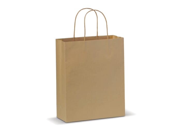 Middelgrote mat papieren draagtas met hengsels van gedraaid papier. Tas heeft een ecologische look. Geschikt als geschenk- en cadeautas. FSC-gecertificeerd.