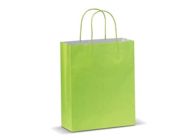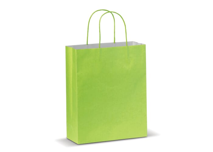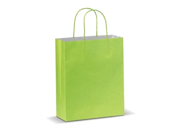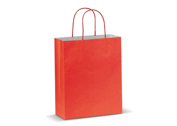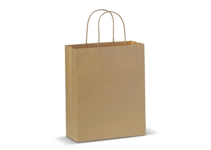 Middelgrote mat papieren draagtas met hengsels van gedraaid papier. Tas heeft een ecologische look. Geschikt als geschenk- en cadeautas. FSC-gecertificeerd.