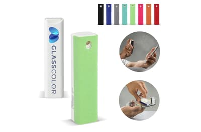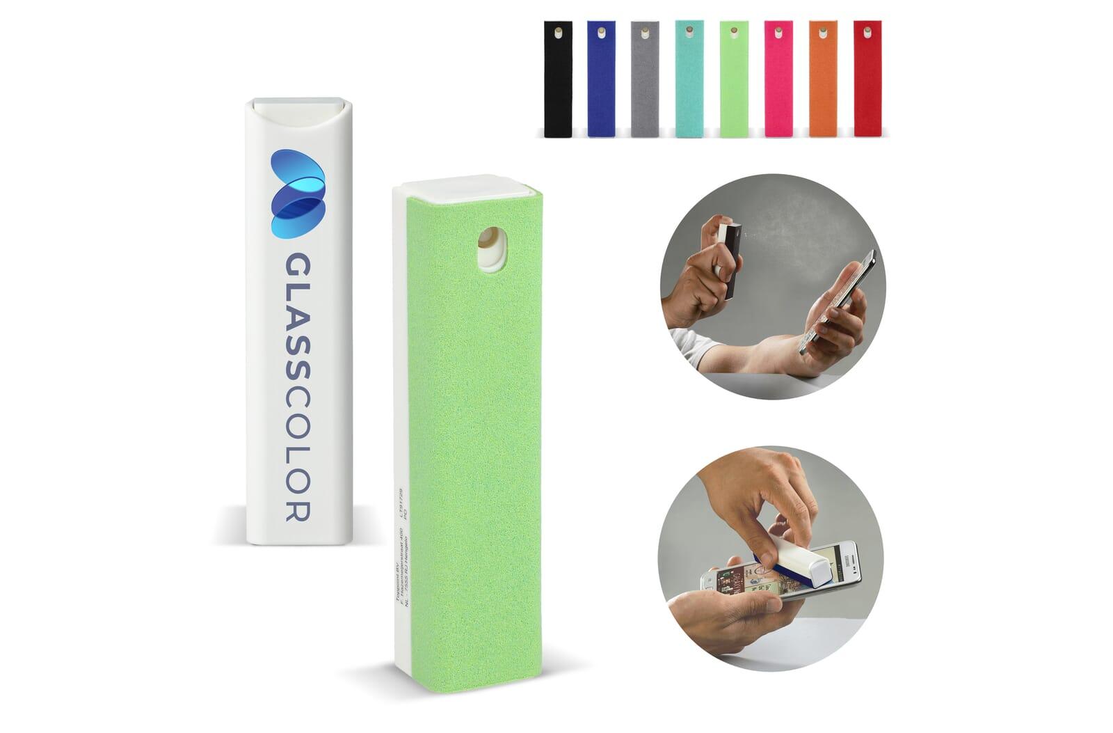 Rechthoekig blokje met schoonmaakspray en microfiber doekje in één voor het reinigen van allerlei beeldschermen.
