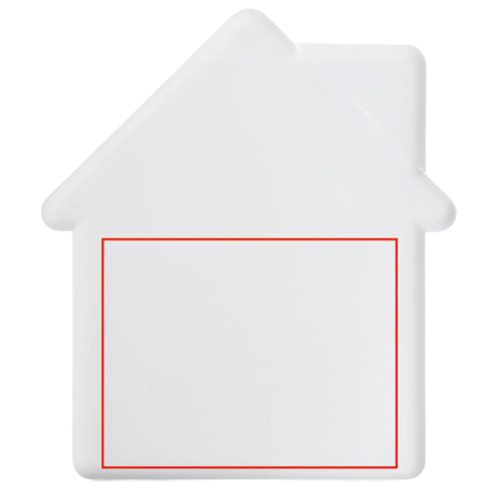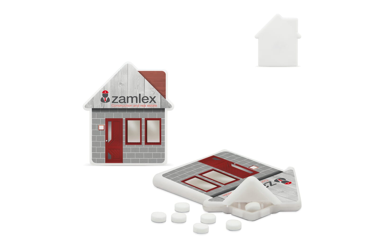 Wit pepermuntdoosje in de vorm van een huis. Opening van het doosje in de schoorsteen. Inhoud: circa zeven gram suikervrije pepermuntjes.
