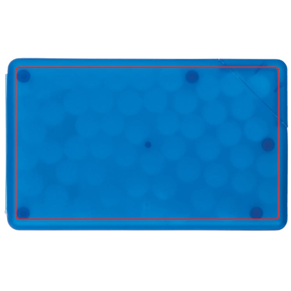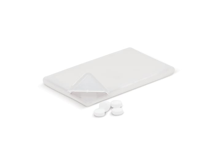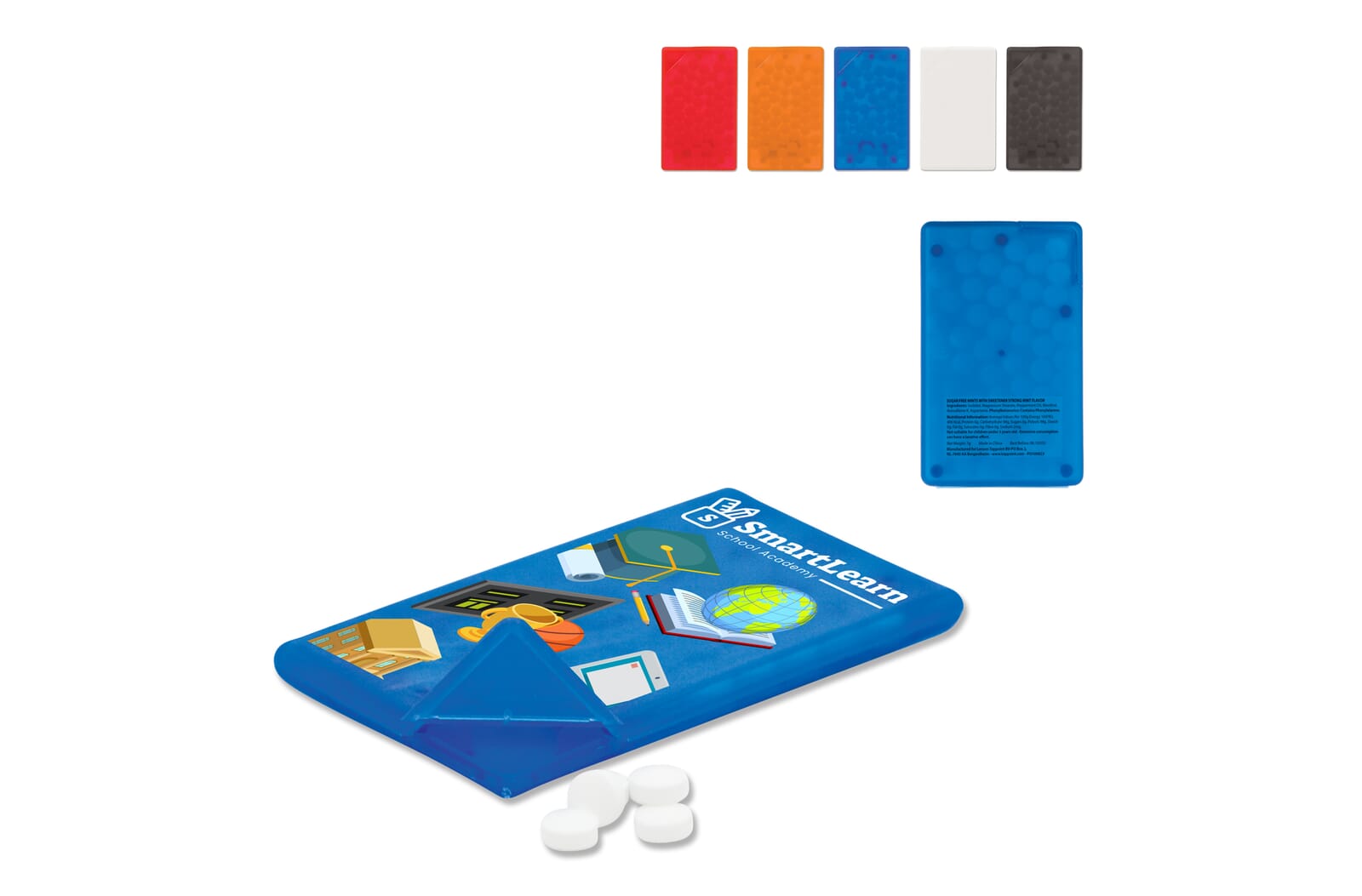 Rechthoekig pepermuntdoosje. Inhoud: circa zeven gram suikervrije pepermuntjes.