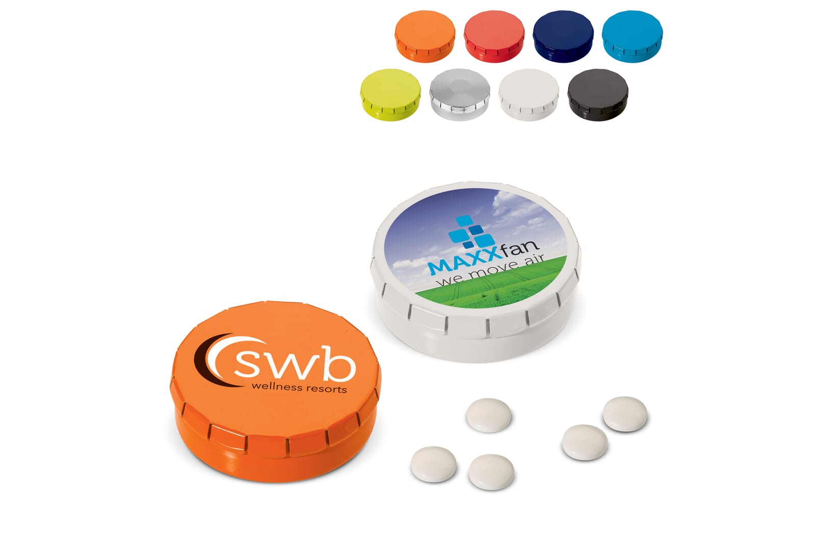 Met één klik is het pepermuntdoosje te openen en met een simpele handbeweging is het doosje te sluiten. Groot drukoppervlak en geschikt voor full-colour digitaal druk. Niet suikervrij. Gevuld gevuld met twaalf gram Europese pepermunt.
