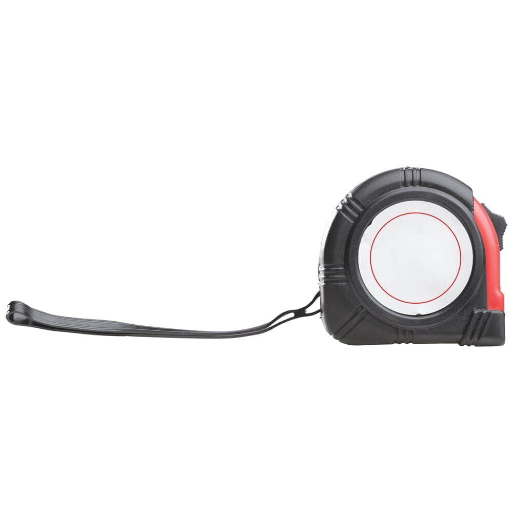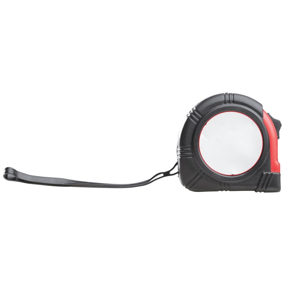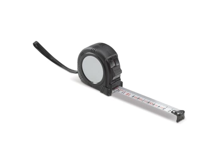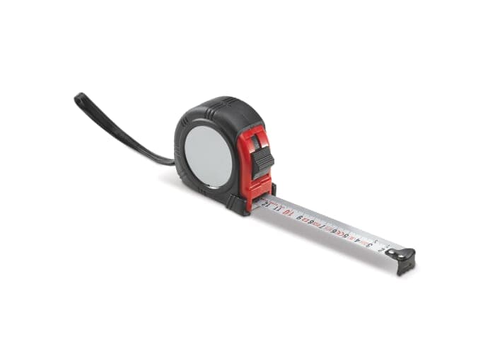 Rolmaat met een meetbereik van vijf meter en een wit meetlint. Eenvoudig mee te nemen dankzij de broekklem en is nauwkeurig door de haak aan het begin van het meetlint.