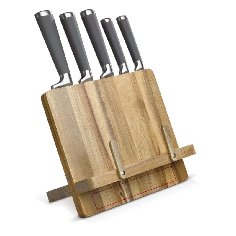Kwalitatief hoogstaande acaciahouten kookboekstandaard. Wordt inclusief vijf verschillende messen geleverd in een geschenkverpakking.