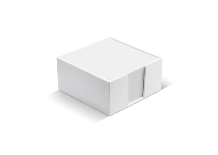 Kubushouder met wit papier. Bedrukking op de zijkanten. Enkelbladsbedrukking mogelijk. Circa 320 houtvrije vellen van 90g/m². Wordt per stuk geseald.