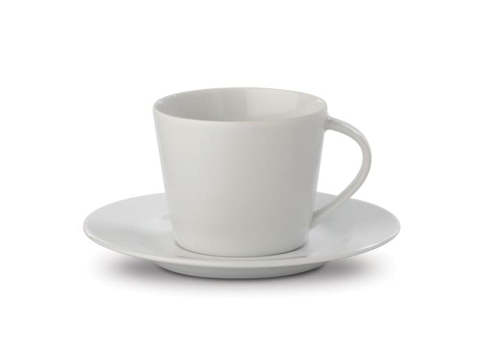 Kop en schotel van porselein. Strak vormgegeven in conisch model. Hoogwaardige kwaliteit, geproduceerd in Europa. Past er goed bij de mok Nice en espresso kop en schotel Firenze.